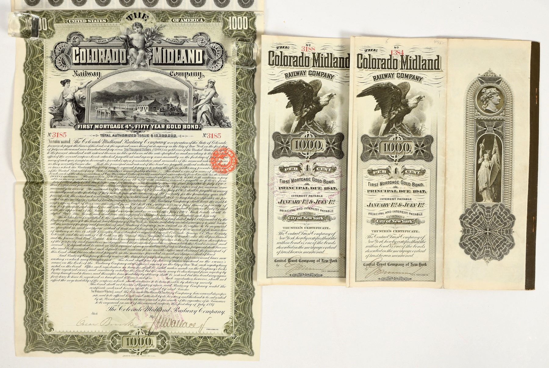 Lot of 3. I/U. Issued 1897. Fine cond. The Colorado Midland Railway Co, $1000, 4%, gold bearer bond. Coupons attached. American BNC printer. Firs standard gauge RR built over the Continental Divide.