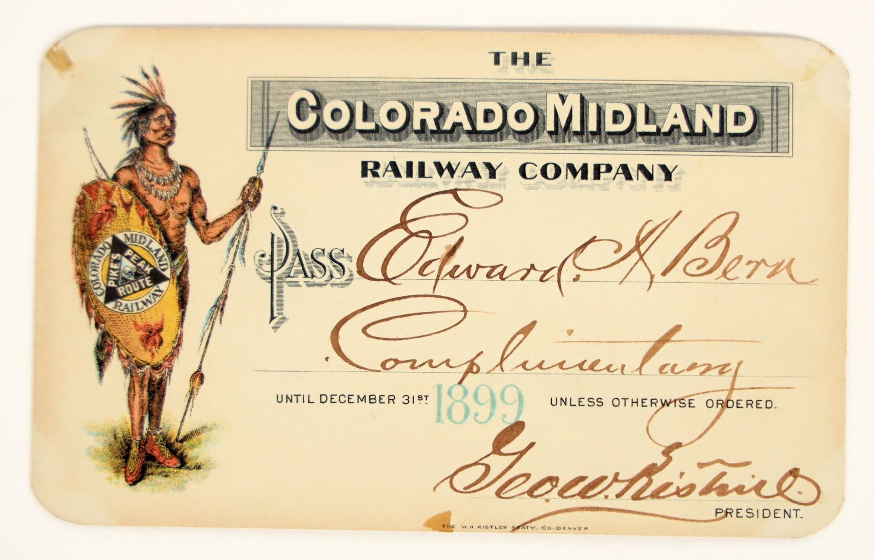 Colorado Midland Railway Co. pass dated 1899 & issued to Edward. A. Bern. It is a complimentary pass signed by the President. Nicely colored vignette of a Native American. No. A 1798 as stamped in red on the back. Inc. in 1883. It ran from Colorado Springs to Leadville and through the divide at Hagerman Pass to Glenwood Springs and Grand Junction.