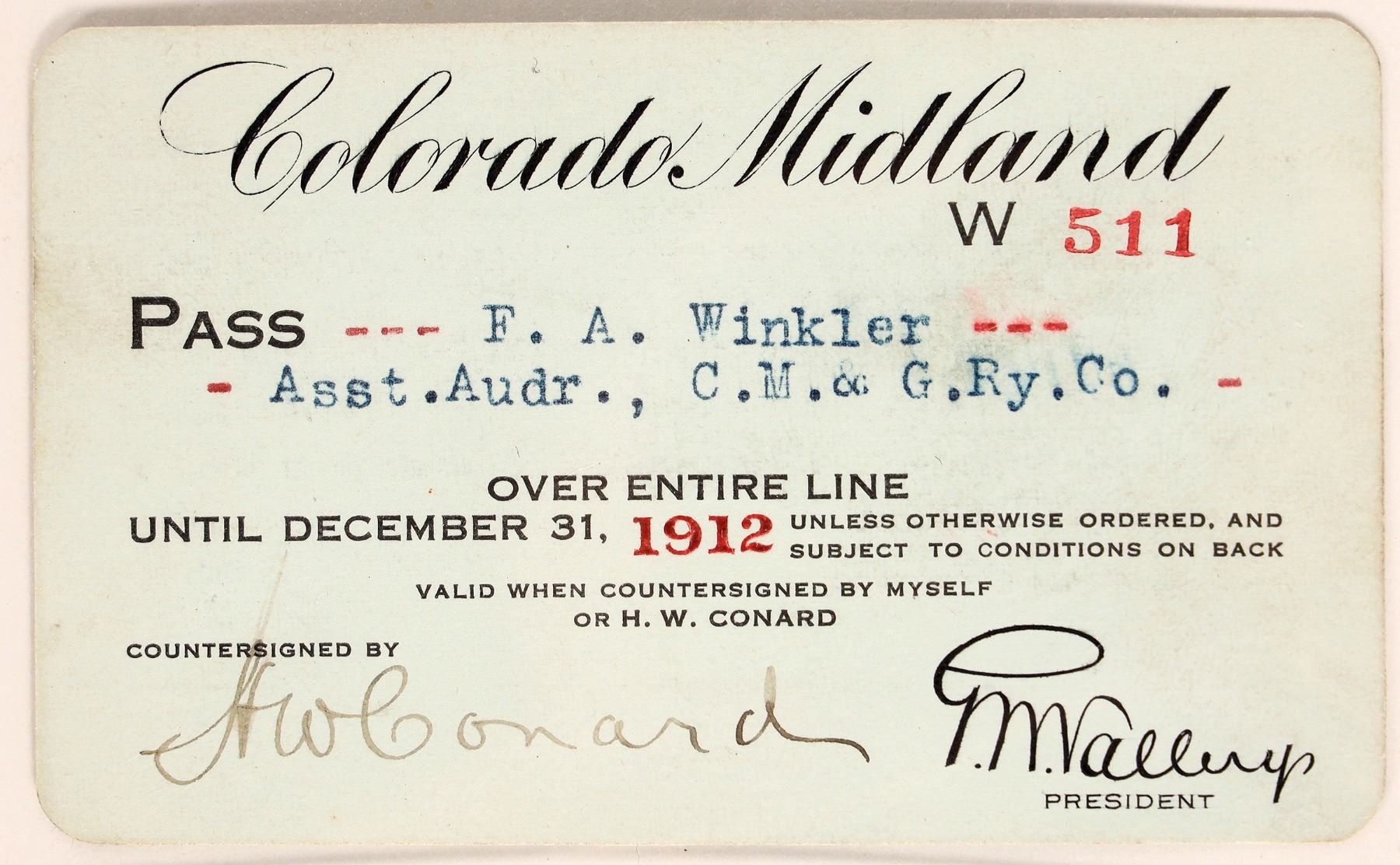 #W511 issued 1912 to F A Winkler, Over Entire Line, CM&G RY Co, signed G W Vallery pres. blu card stock, title handwritten style title, unk printer. Incorp 1883 as the first standard gauge RR over Continental Divide, abandoned in 1918. [Ron Lerch Collection] [ Colorado