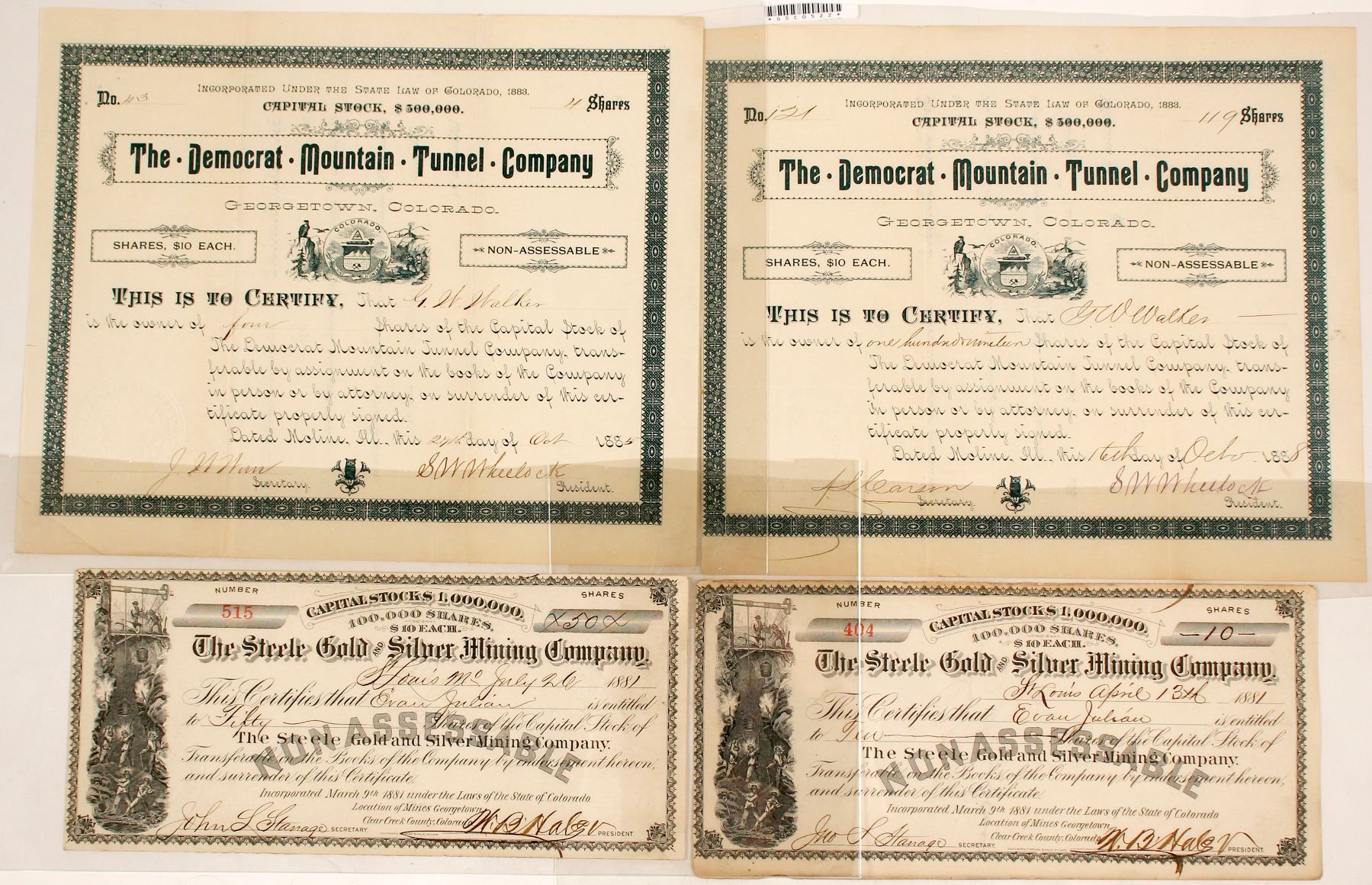 2 from Steele Gold and Silver Mining#404 i/u to Evan Julian 1881, 10 shares, #515 i/u ti Evan Julian 1881, both signed by president, incorporated in CO. 2 from Democrat Mountain Tunnel, #43 i/u to G. Walker 1883 4 shares, #121 i/u to G. Walker 1888 119 shares, both signed by president Wheelock, incorporated in CO
