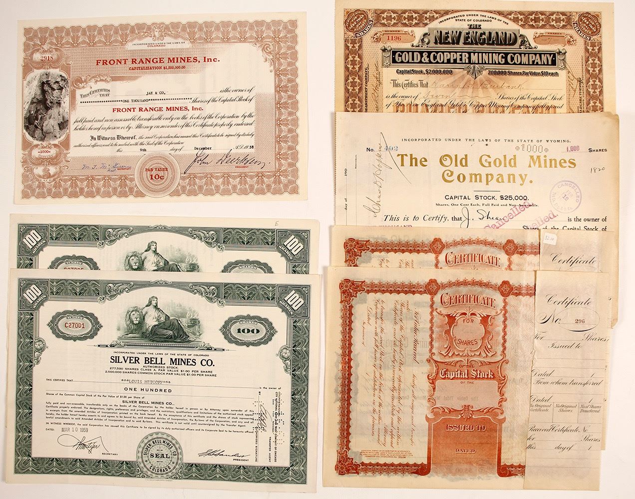 1) New England Gold & Copper Mining issued 1912 2)Front Range Mines issued 1958 3) 2 Ophir Tidal Wave Mining u/i 4) 2 Silver Bell Mines issued 1959 and 1961 5) Old Gold Mine issued 1901 Date: Location: Colorado HWAC# 56170