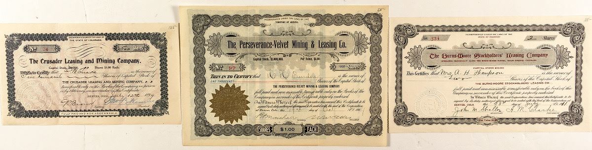 Three rare certificates. 1) The Crusader Leasing and Mining Company. No. 74, issued in 1899. Not cancelled. 2) The Burns-Moore Stockholders' Leasing Company. Idaho Springs. No. 334, issued in 1911. Not cancelled. 3) The Perseverance-Velvet Mining & Leasing Company. No. 97, issued in 1907. Not cancelled. City: State: Colorado Date: 1899-1911 hwac# 34350
