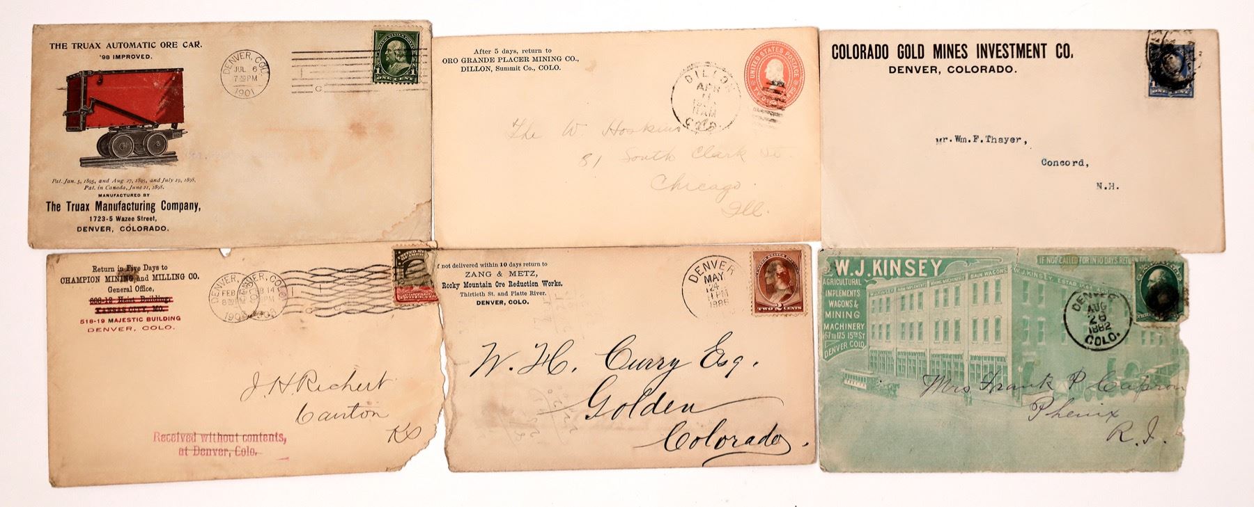 Lot of six advertising covers. 1) Full Face WJ Kinsey merchant. Selling mining, agriculture, machinery, etc. Spectacular. 1882, 2) Truax Automatic Ore Cart with great color corner advertising! 1901. 3) Oro Grande Placer. 1902. 4) Champion Mining and Milling. 1903. 5) Zang & Metz, Rocky Mountain Ore Reduction Works. 1885. 6) Large lettered Colorado Gold Mines Investment Company.