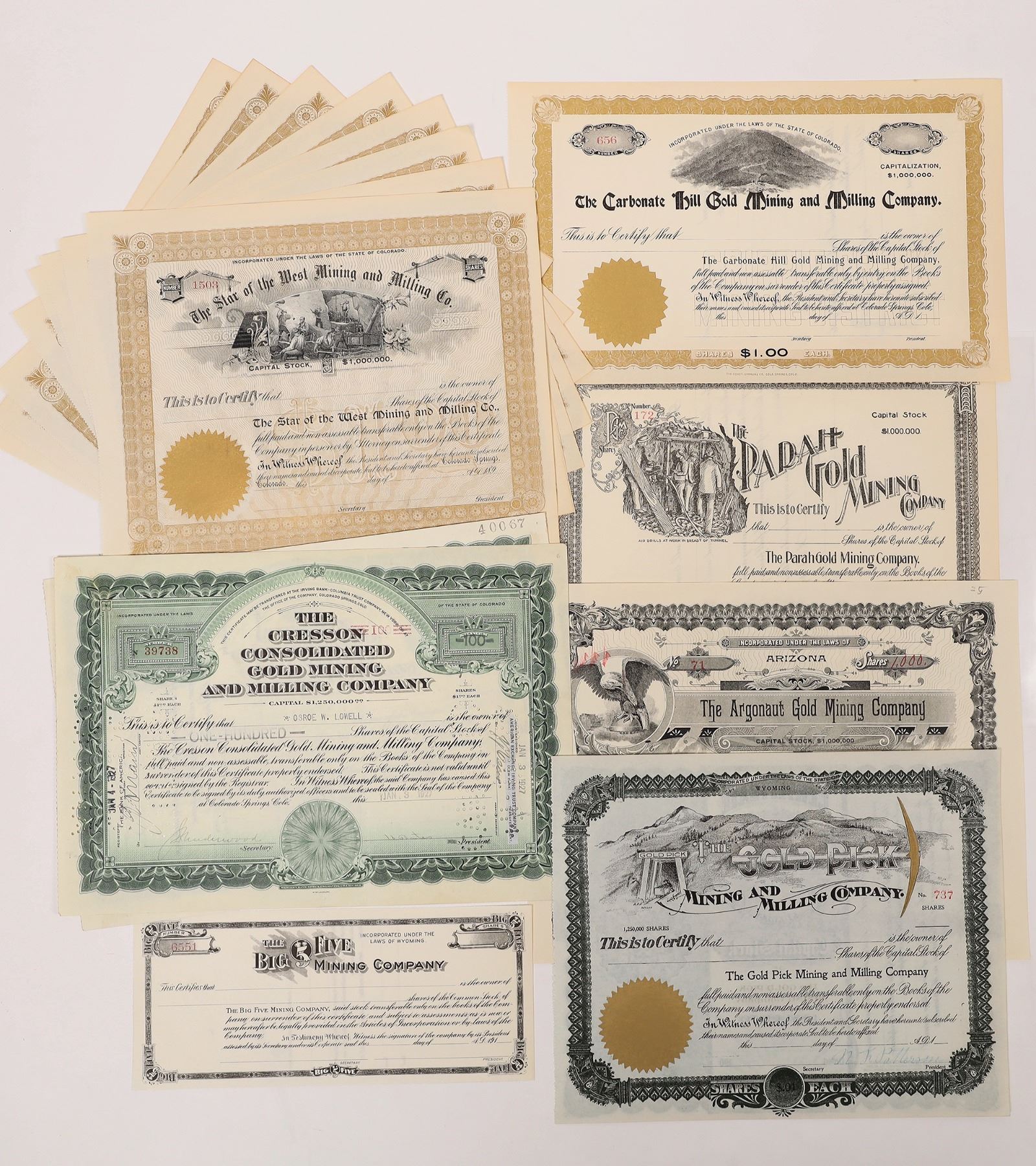 Lot of 17. Duplication. Mix of issued and unissued. Includes: Gold Pick Mining & Milling Co. (singed by president but uniss., great vignettes incl. gold pick); Cresson Cons. Gold Mining & Milling Co. (1927 and 1928); Argonaut Gold Mining Company (1906, Ophir); Parah Gold Mining Co. (uniss.); Big 5 Mining Co. (uniss.); Carbonate Hill Gold Mining & Milling Co. (CC, uniss.); and Star of the West Mining & Milling Company (Cripple Creek, 10 uniss., 1890s).