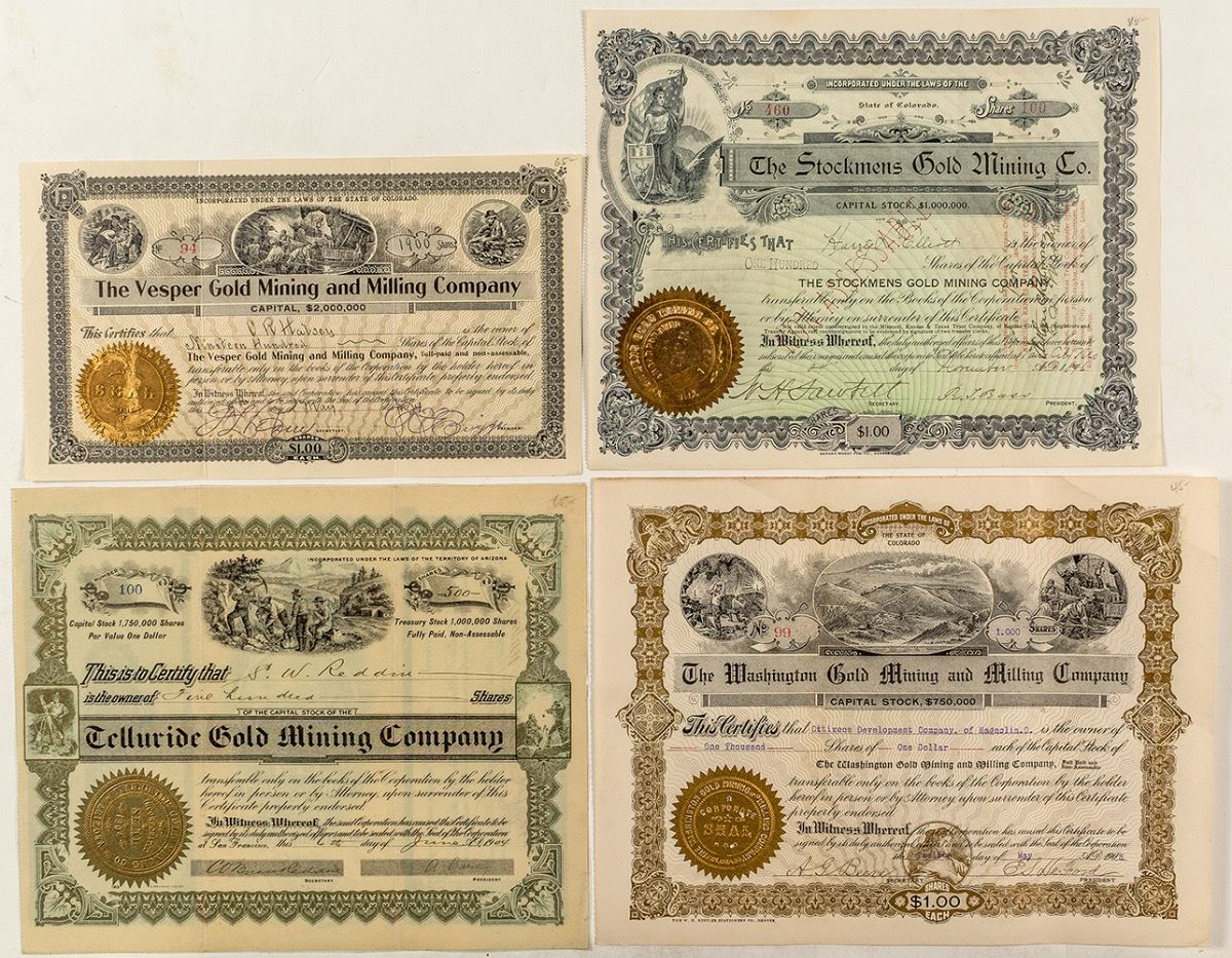 1) The Stockmens Gold Mining Company. Issued for 100 shares in 1896. Not cancelled. Gold seal and allegorical vignette. 2) The Vesper Gold Mining and Milling Company. Issued for 1900 shares in 1904. Not cancelled. Gold seal and trio of mining vignettes. 3) The Washington Gold Mining & Milling Company. Issued for 1,000 shares in 1905. Not cancelled. Gold seal, gilt border and three mining vignettes. 4) Telluride Gold Mining Company. Issued for 500 shares in 1904. Not cancelled. Nice border and mining vignette. Unfortunately, it was laminated. (Prag Collection) City: State: Colorado Date: 1896-1905 ID# 34415