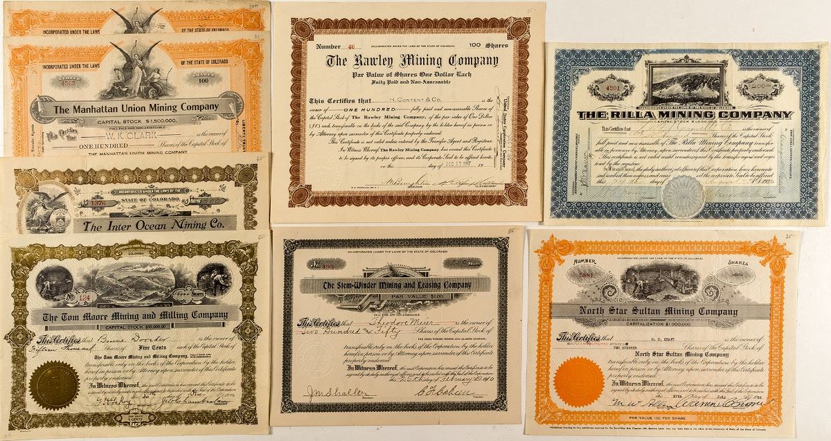 Lot of eight. Includes: Rilla Mining Company (1916, not cxl), North Star Sultan Mining Co. (1936, not cxl), Rawley Mining Co. (1917, not cxl), Stem-Winder Mining & Leasing Co. (1910, not cxl), Tom Moore Mining & Milling Co. (1906, not cxl), The Inter Ocean Mining Co. (1908, not cxl), and The Manhattan Union Mining Co. (two 1920, not cxl). (Prag Collection) City: State: Colorado Date: 1906-1936 ID# 34229
