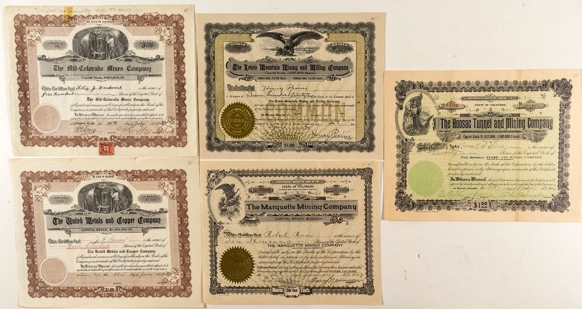 Five different. Includes: The Marquette Mining Co. (1929, not cxl), The Hoosac Tunnel and Mining Co. (1906, not cxl), The Lewis Mountain Mining & Milling Co. (1920, not cxl), The United Metals and Copper Co. (1915, not cxl), and The Mid-Colorado Mines Co. (1916, pencil cxl). (Prag Collection) City: State: Colorado Date: 1906-1929 hwac# 34348