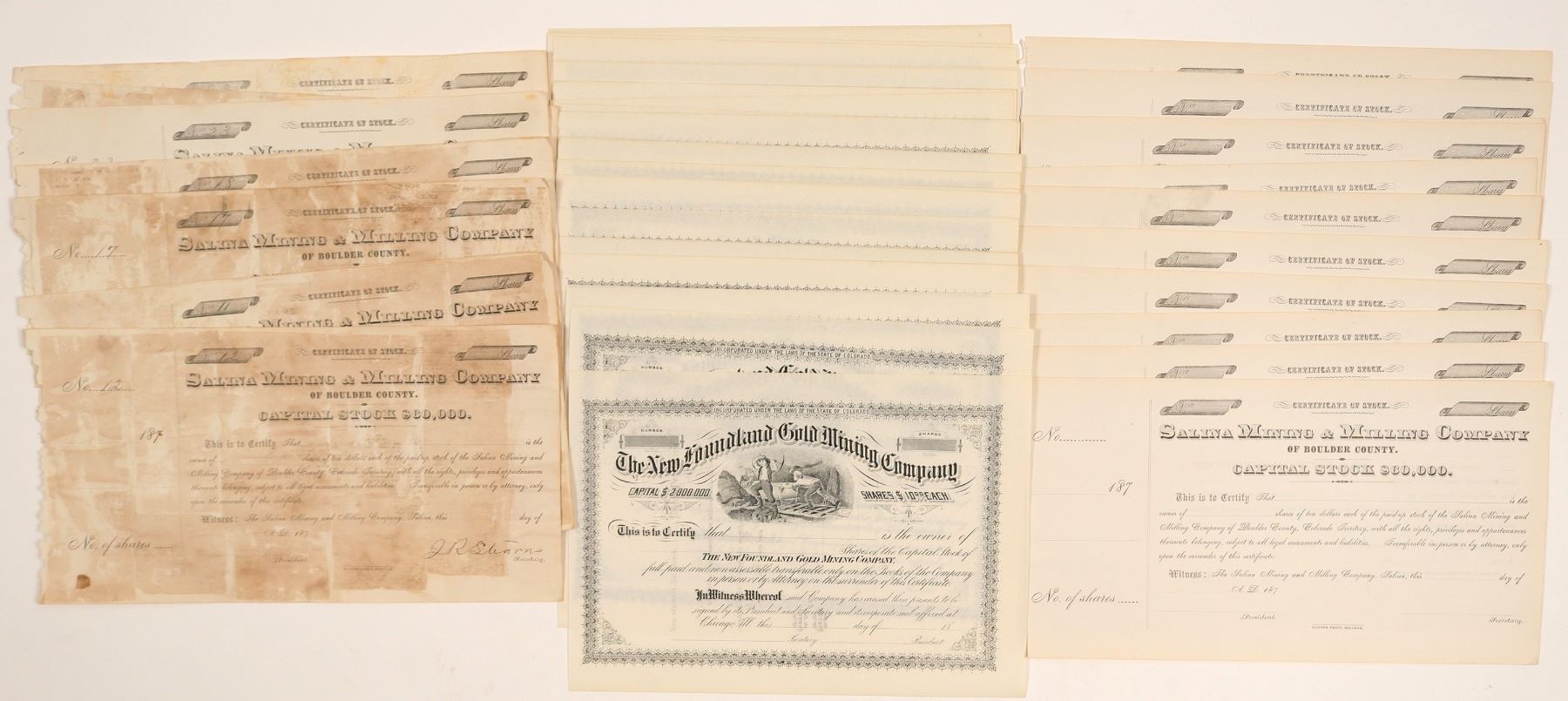 28 unissued New Foundland Gold Mining stocks, 18 Salina Mining of Boulder County stock-several have heavy toning Ken Prag Collection