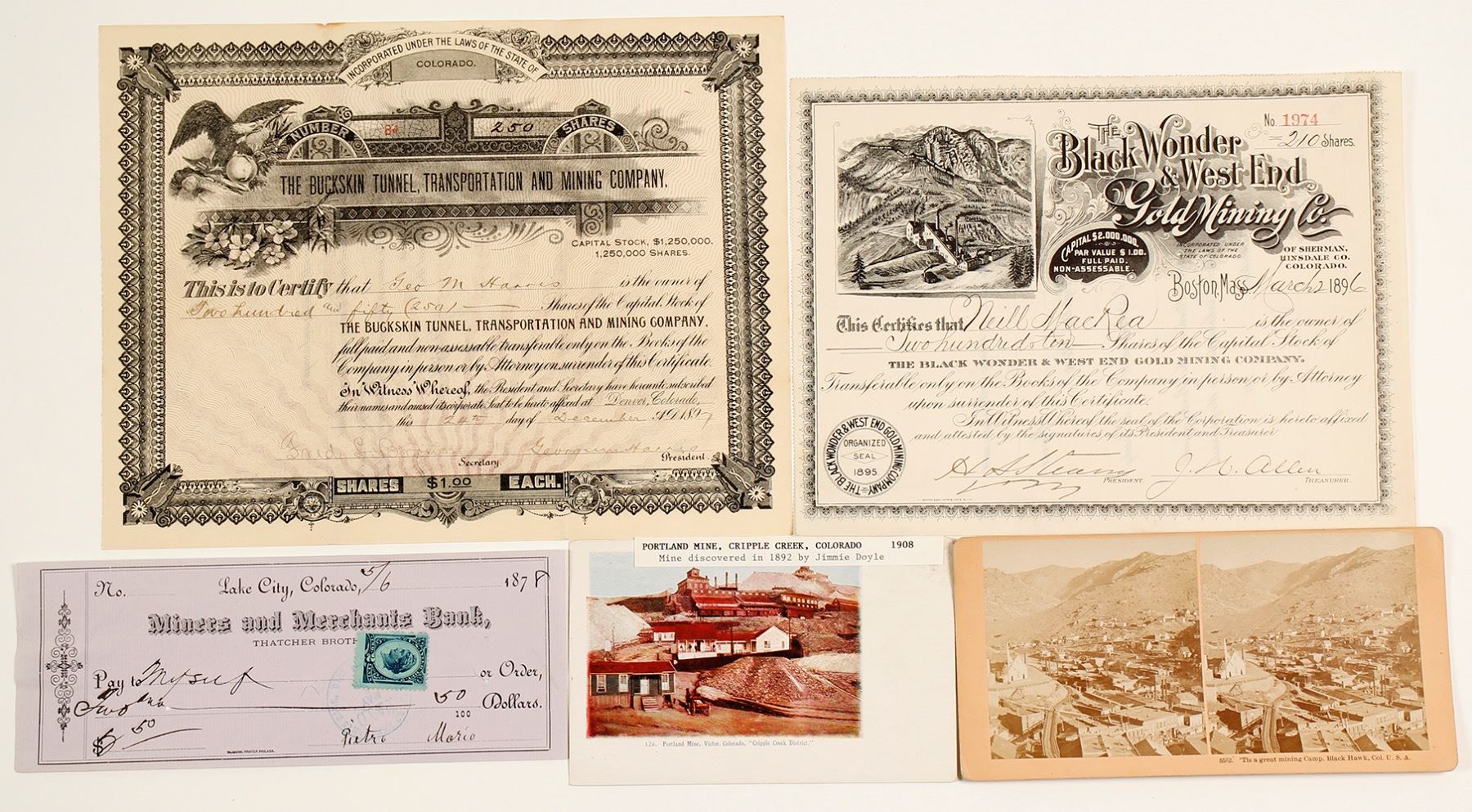 Lot of 5. 1) Two stock certificates. a) The Black Wonder & West End Gold Mining Co. of Sherma, Hinsdale County, Colorado. Issued, not cancelled, 1896. Gorgeous vignette of mine on hillside. Very fine condition. b) The Buckskin Tunnel, Transportation and Mining Company. Leadville. Issued, not cancelled, in 1897. Folds, other light wear. 2) Stereoview by Kilburn No. 5582. Birds-eye view of Black Hawk. 3) Lake City, Colorado check, 1878, Miners and Merchants Bank. 4) Unused early postcard of the Portland Mine in Victor. (Al Adams Gold Rush Memorabilia Collection) Date: 1896-1908 Location: Colorado HWAC# 58411