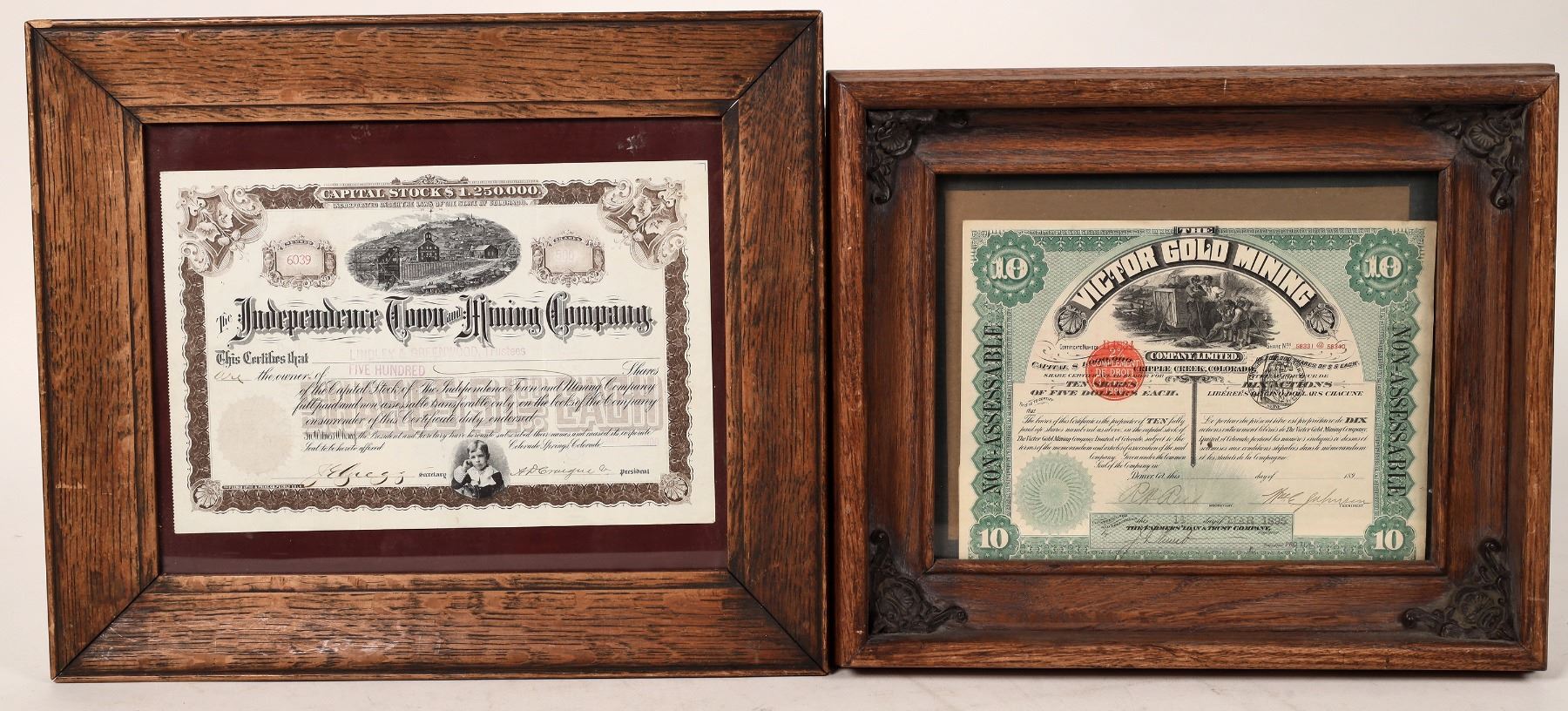 2 framed Colorado mining stocks. Issued 1900 Indepence Town and Mining, issued 1895 Victor Gold Mining. Colorado Gary Bracken Collection