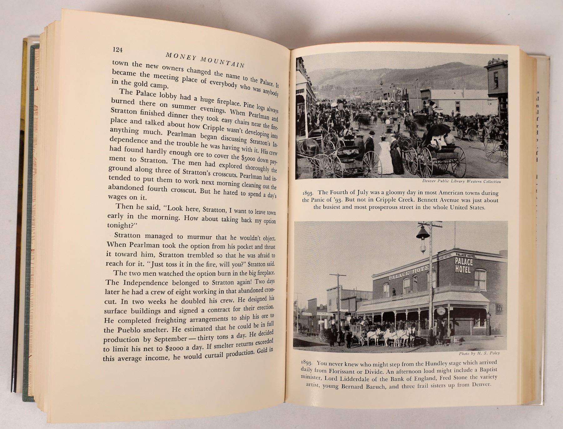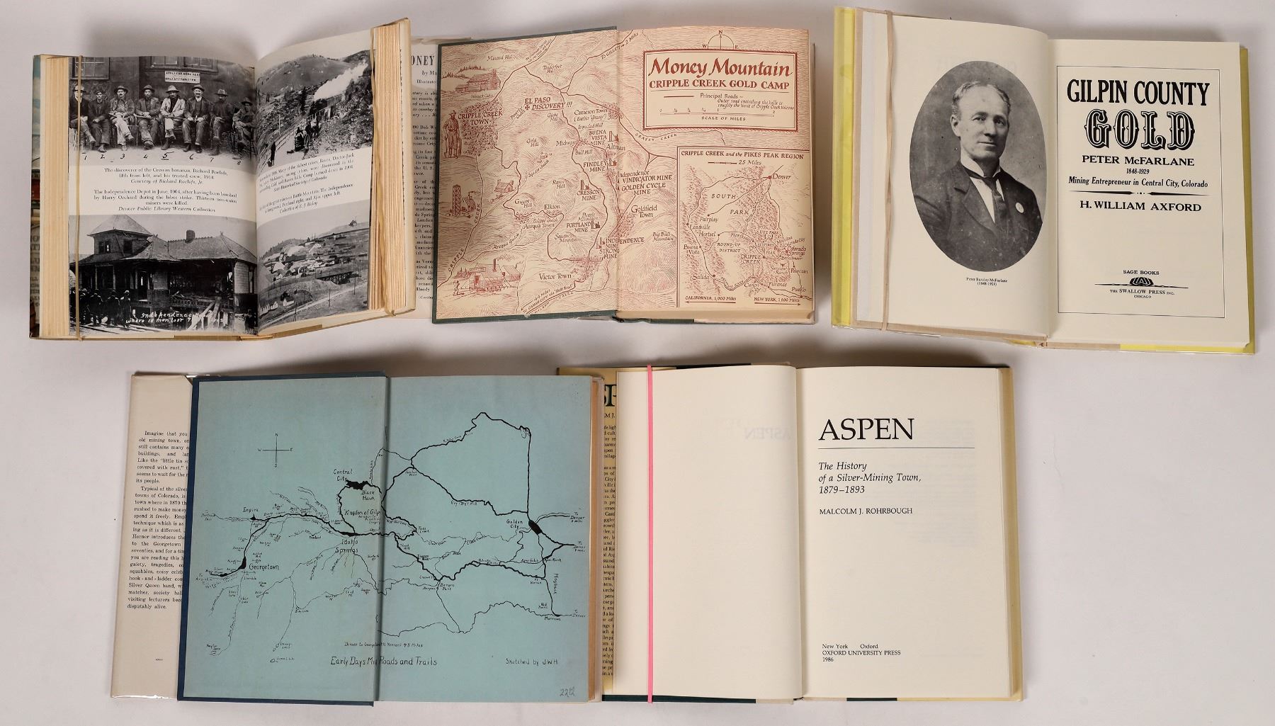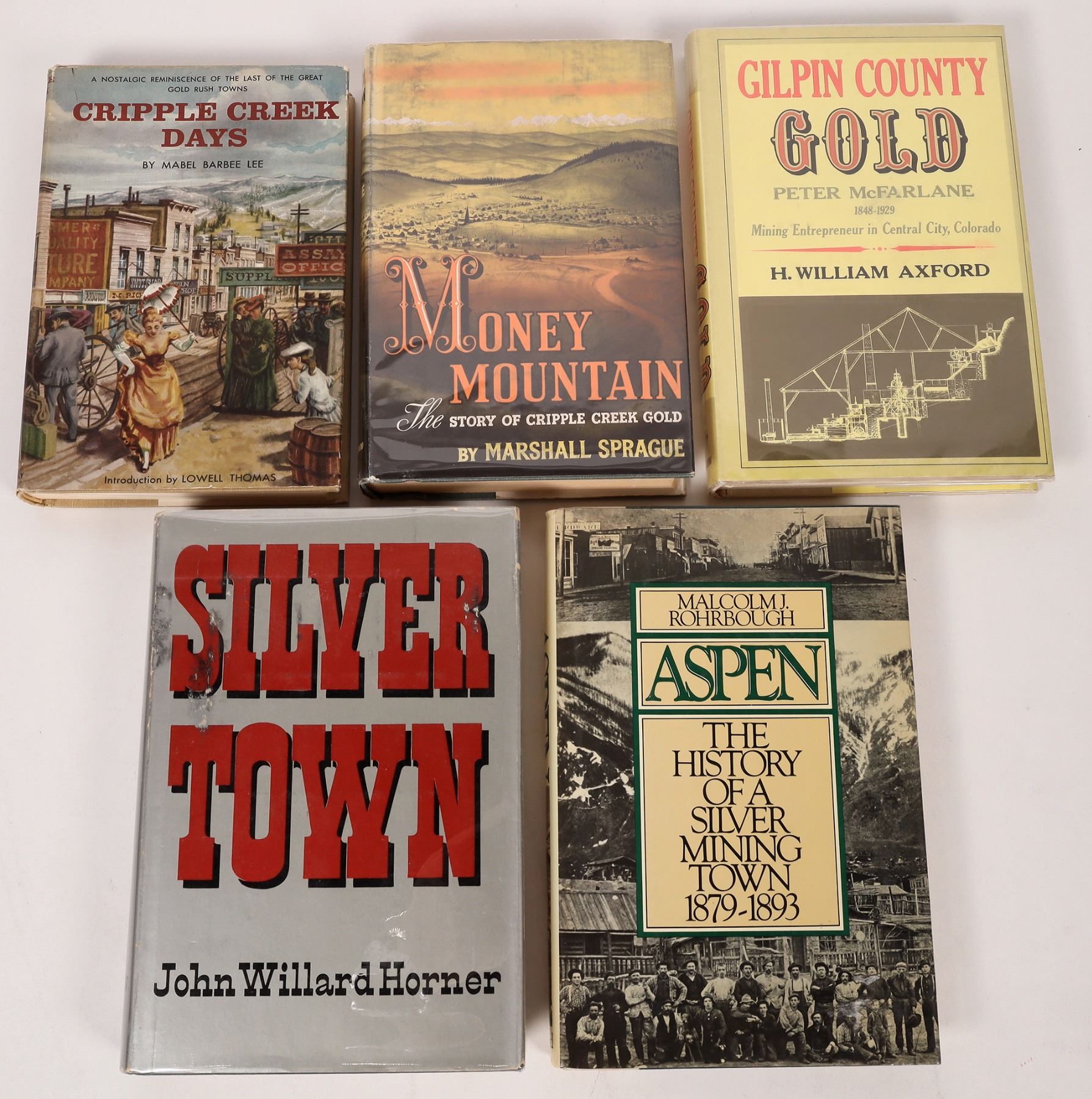 Colorado Mining Town Books (5) #2. 1) "Silver Town", Georgetown of the seventies, by John W. Horner, published by Caxton Printers, Caldwell, ID, 1950 (6" x 9" HB, 322 pages). 2) "Money Mountain", the Story of Cripple Creek Gold, by Marshall Sprague, published by Little, Brown & Co., Boston, 1953. (6" x 8-1/2" HB, 342 pages). 3) "Aspen", the History of a Silver Mining Town, 1879-1893, by Malcolm J. Rohrbough, Publ. by Oxford University Press, 1986. (6" x 9" HB, 263 pages. signed by author). 4) "Cripple Creek Days", a nostalgic reminiscence of the last of the great gold rush towns, by Mabel B. Lee, publ. by Doubleday & Co., 1958. (6" x 9" HB, 270 pages). 5) Gilpin County Gold", by H. Wm. Axford, publ. by Swallow Press, Chicago, 1976. (6" x 9" HB, 210 pages).
