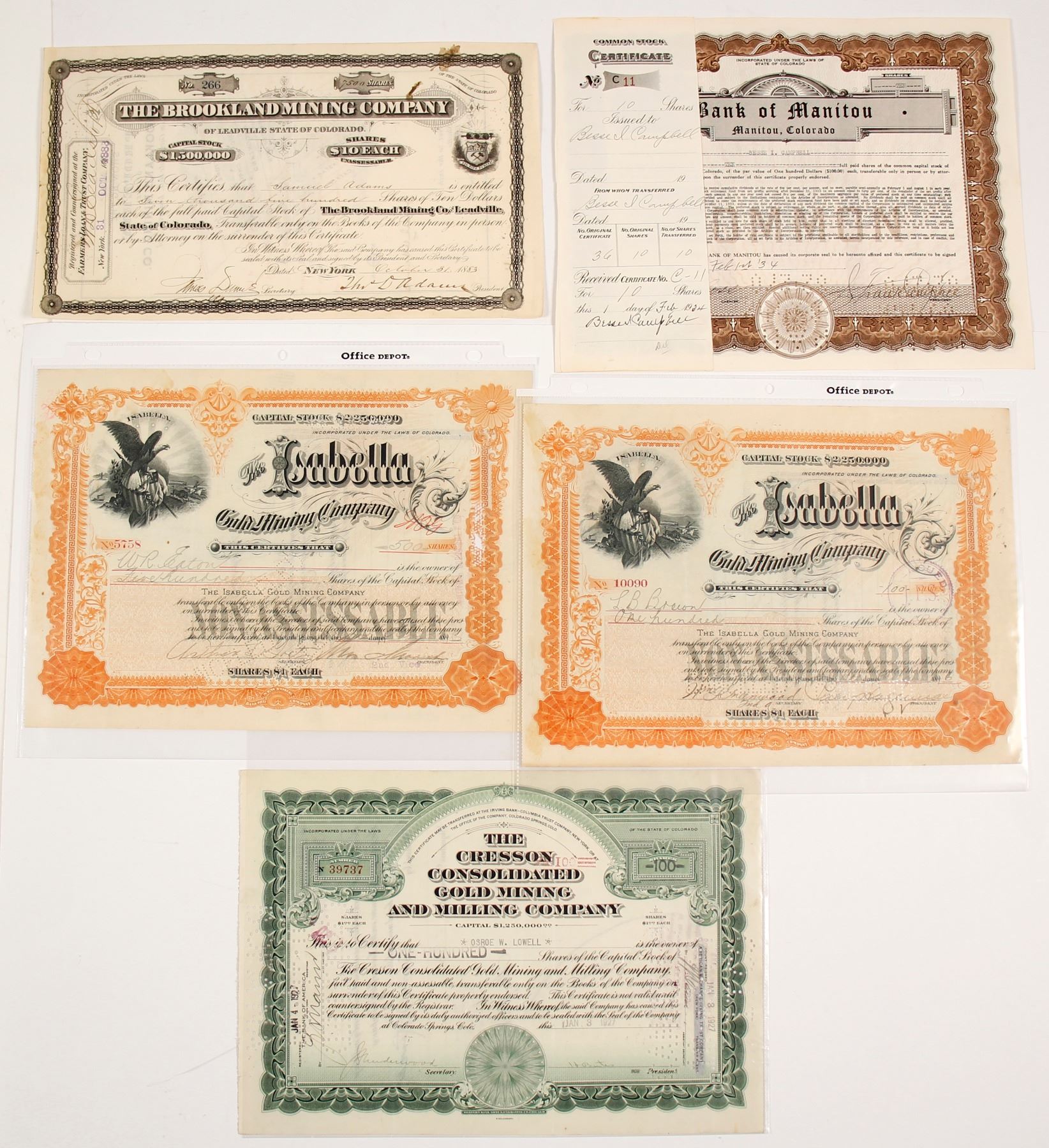 Bank of Manitou i/p 1934, 2 Isabella Gold Mining i/c 1896 (with eagle vignette), Cresson Consolidated Gold Mining and Milling i/c 1927, Brookland Mining i/u 1883 with stain and many pin holes. State: Colorado City: Date:
