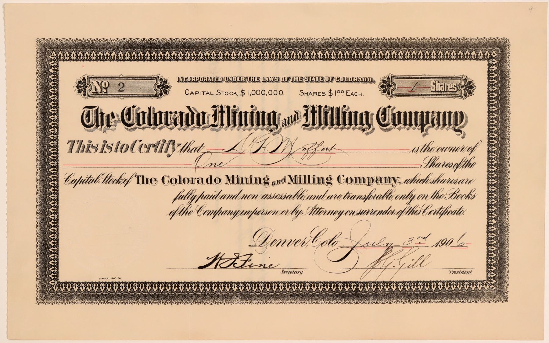 Great certificate. Issued to D.H. Moffat. Since this in certificate # 2, one would suspect Moffat was at least part owner. Simple. Excellent condition - no edge, corner, discoloration or pin hole issues. Signed by secretary Fine and president GIll. Dateline Denver July 3, 1906.