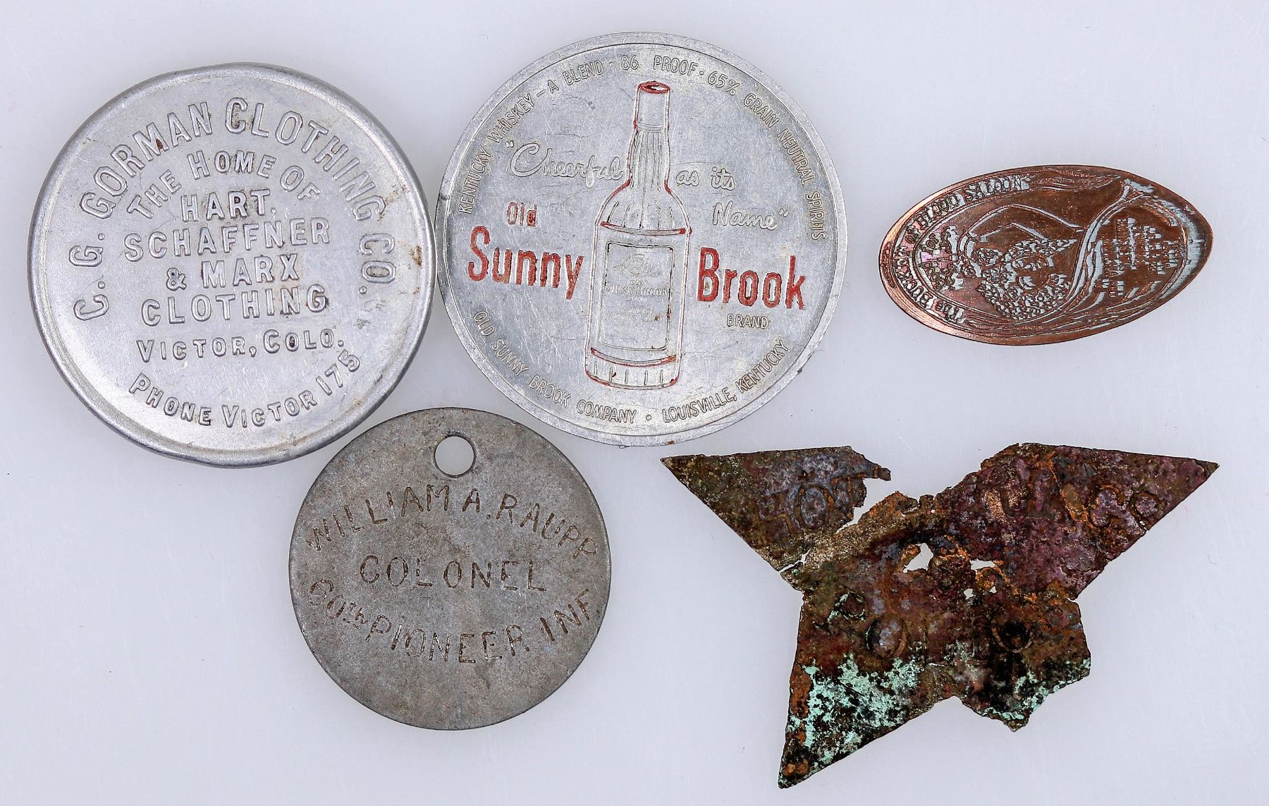 Aluminum-CG Gorman Clothing, Victor. Sunny Brook. William A Raupp. Copper-Pleasure Palace, Victor. Partial copper, unknown.