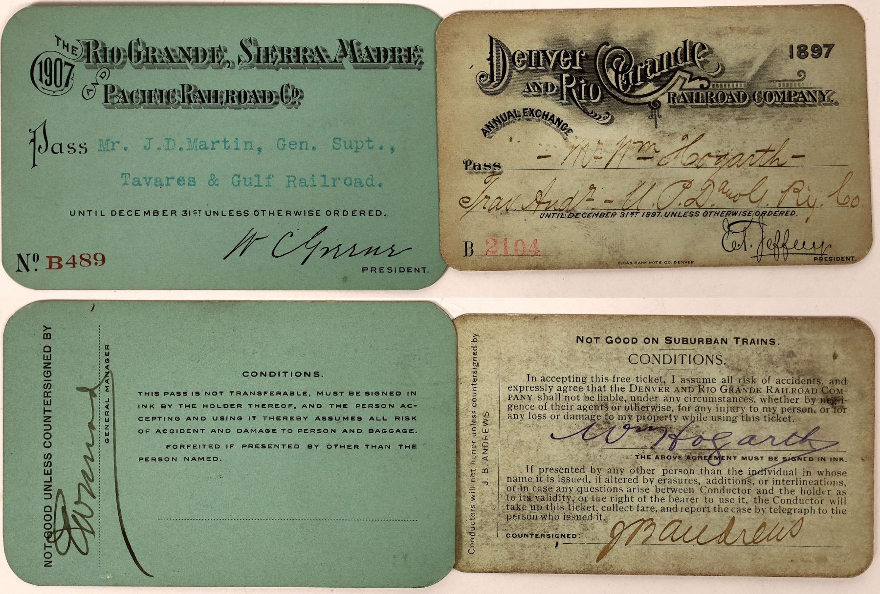 Lot of two rare railroad passes: Denver and Rio Grande,1897; Rio Grande, Sierra Madre and Pacific Railroad, 1907.