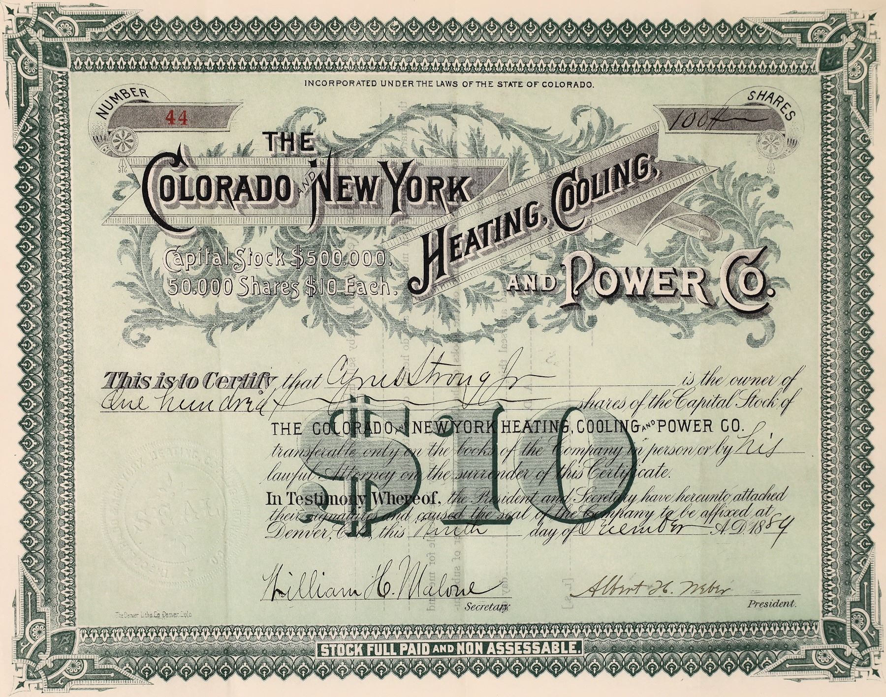 Inc. in Colorado. No. 44, issued to Cyrus Strong Jr. for 100 shares in Denver in 1889. Signed by president Albert H. Weber and secretary William H. Malone. Not cancelled. Green border and background with floral underprint design. Printed by the Denver Litho. Co. Folds, creases. 9.25 x 11.5" They had a patent in the 1890s for heating by liquid circulation by HJ Allison.