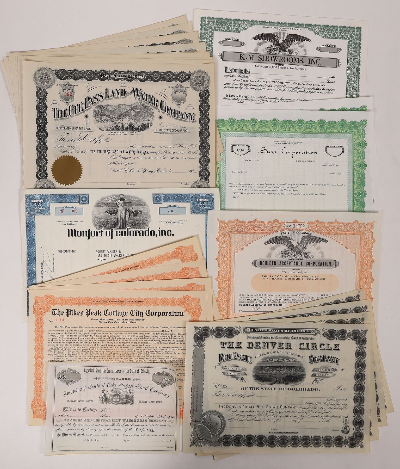 Lot of 30. Most unissued. Includes: Swansea & Central City Wagon Road Co. (unissued); Denver Circle Real Estate Company (4 uniss., 1880s, great Denver. vignette); Pike Peak Cottage City Corporation (4 uniss., 1920s); Boulder Acceptance Corporation (1958); Monfort of Colorado, Inc. (1970); Ute Pass Land & Water Company (17 uniss. stocks, 1890s, great vignettes); Susa Corporation (2 uniss.); and K-M Showrooms, Inc. (uniss.).