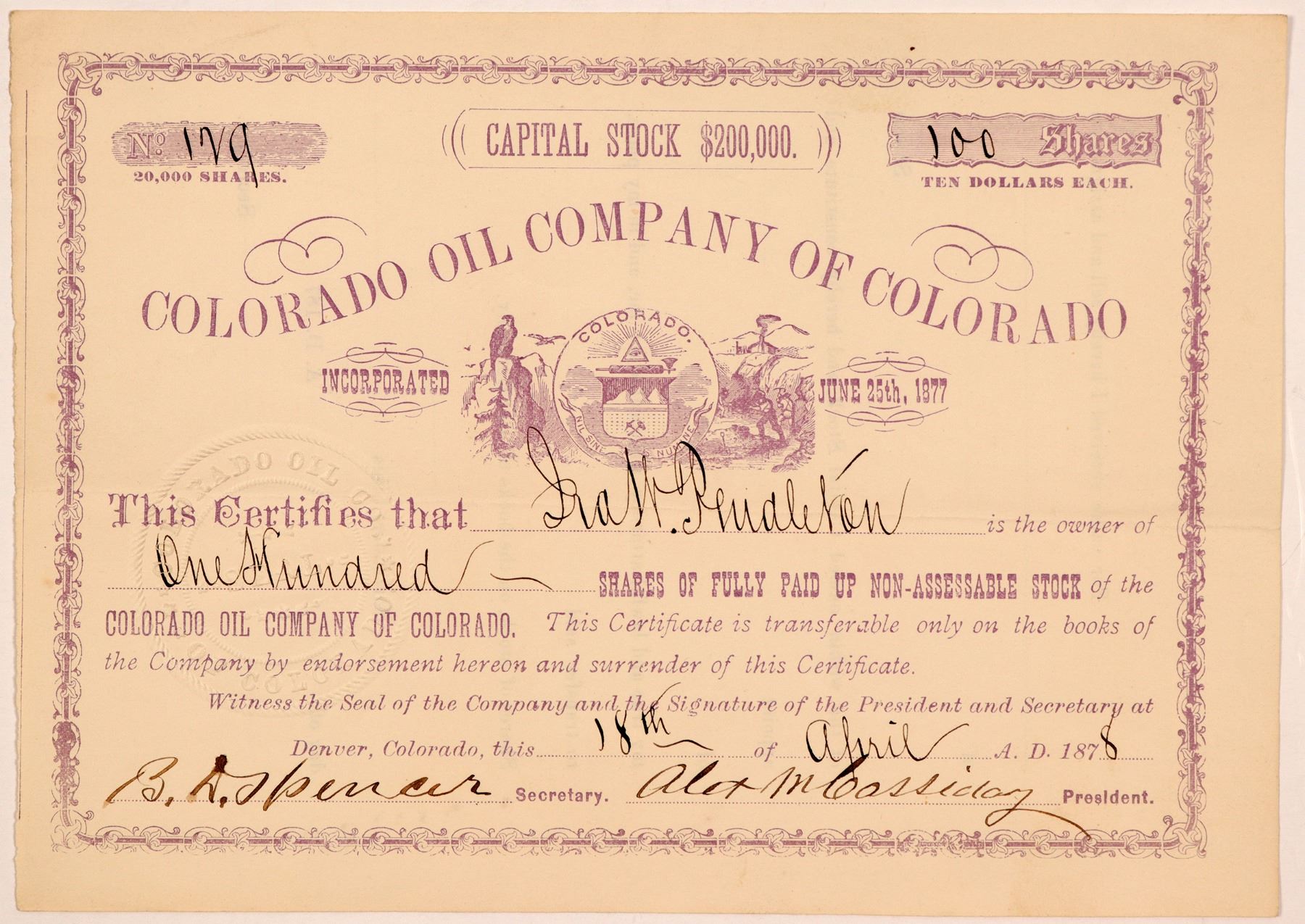 Inc. June 1877. No. 129, issued for 100 shares to Ira Pendleton on April 18th, 1878 in Denver. Signed by president Alex M. Cassiday ad secretary BA Spencer. Not cancelled. Purple border and print, vignette featuring Colorado state seal. No printer listed. 5.5 x 7.5" Light wear. The Colorado Oil Company was first formed in the 1860s and tried to drill for oil outside of Florence, Fremont County, Colorado. Production never reached high levels, but, in 1881, Alex Cassiday (this company's president and an oil promoter) and oil driller Isaac Canfield struck deep oil at the Oil Spring site. This led to the development of the Florence Oil Field. [https://coloradoencyclopedia.org/article/fremont-county] Ken Prag Collection