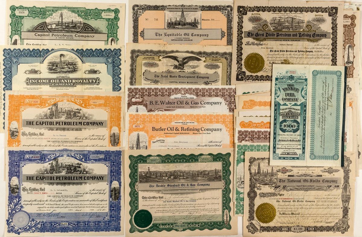 40+ pieces! Earliest is 1917, latest is 1955. Most fall in 1910s-1930s. Very pictorial group! Very few unissued. Some of the companies included: Equitable, Axial Basin Development Co., Butler Oil & Refining, Double Standard Oil & Gas, B.E. Walter Oil & Gas, Capitol Petroleum, Income Oil & Royalty, Big Three Oil Corp., Great Western Petroleum, Denver Northern Oil Co. White Rock Oil & Refining, Vindicator Oil & Shale, West Belt Oil & Gas, Lucky Long Oil, Great Divide Petroleum & Refining, and more. Please inspect. (Prag Collection) City: State: Colorado Date: 1917-1955 ID# 34269