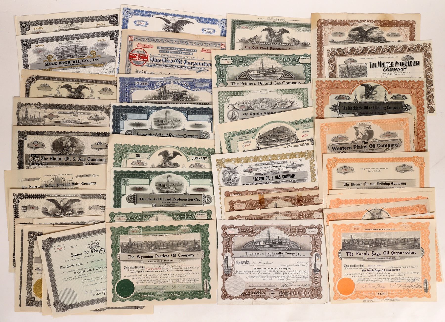 About 50 Colorado oil stocks, c. 1914-55, mostly older. Lorado Oil & Gas, United Petroleum, Primero OIl and Gas,Out West Petroleum, Pelican Gas, Wyoming Blackfoot, Venture Oil, Mile High, Lone Star, Apex Refining, Wyoming Peerless etc. See photo. A few condition issues. Colorado Ken Prag Collection