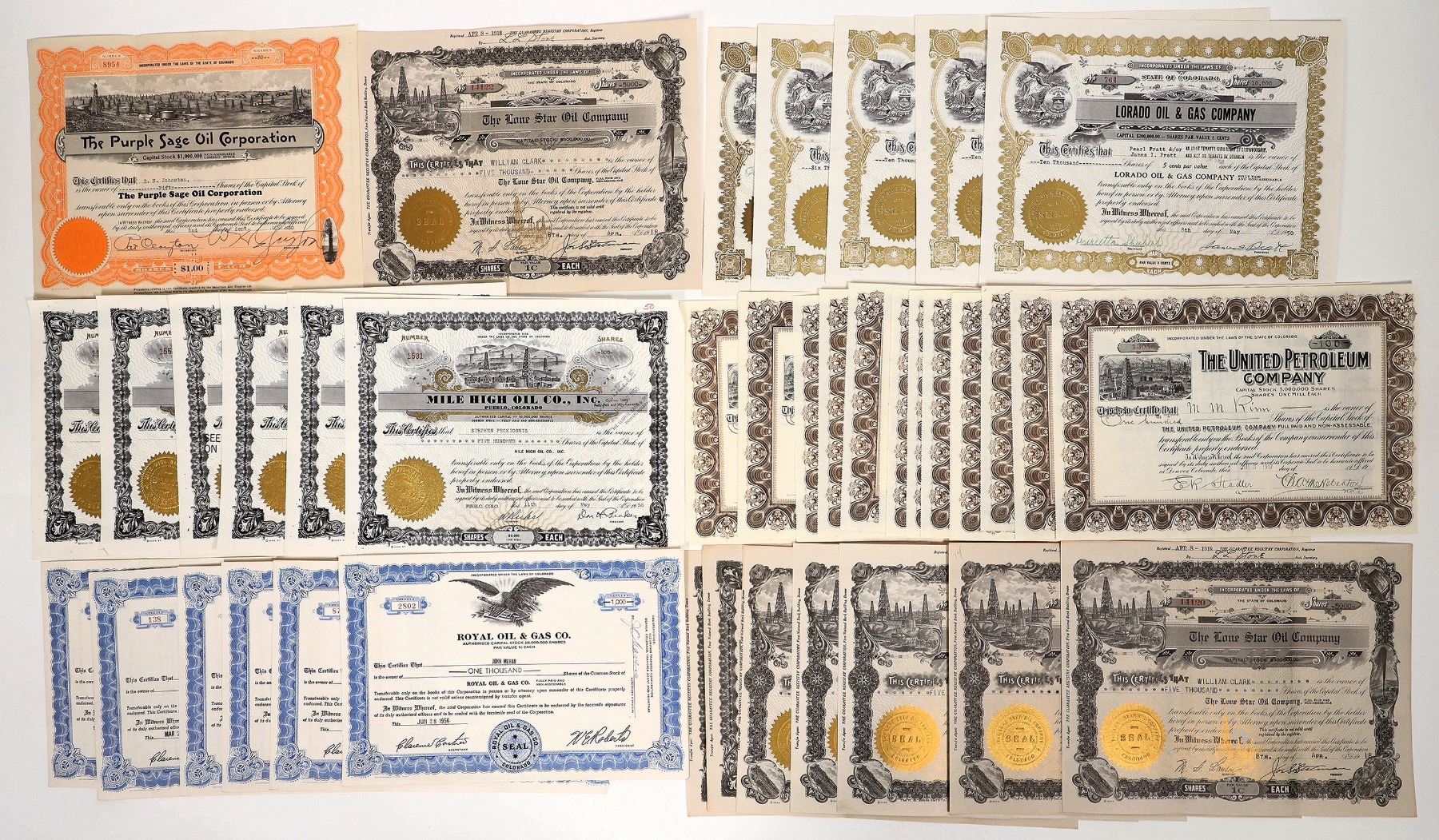 Group of approximately 39 stock certificates from six Colorado oil companies: Purple Sage Oil Corp., Lone Star Oil Co., United Petroleum Co., Mile High Oil Co., Royal Oil & Gas Co., and Lorado Oil & Gas Company. Certificates date 1917-1956. All are issued and uncancelled. Great vignettes of oil fields/oil derricks. All in good condition.