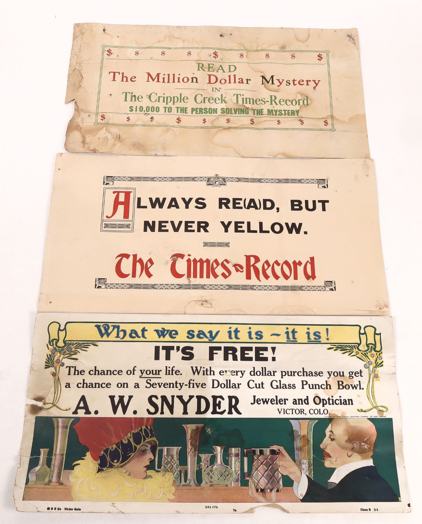 3 paper Colorado advertising signs. c. 1910's-20's. The Times Record, Cripple Creek Times Record, A W Snyder Jeweler and Optician. 11x20.5". All have stains, holes etc. Please inspect.