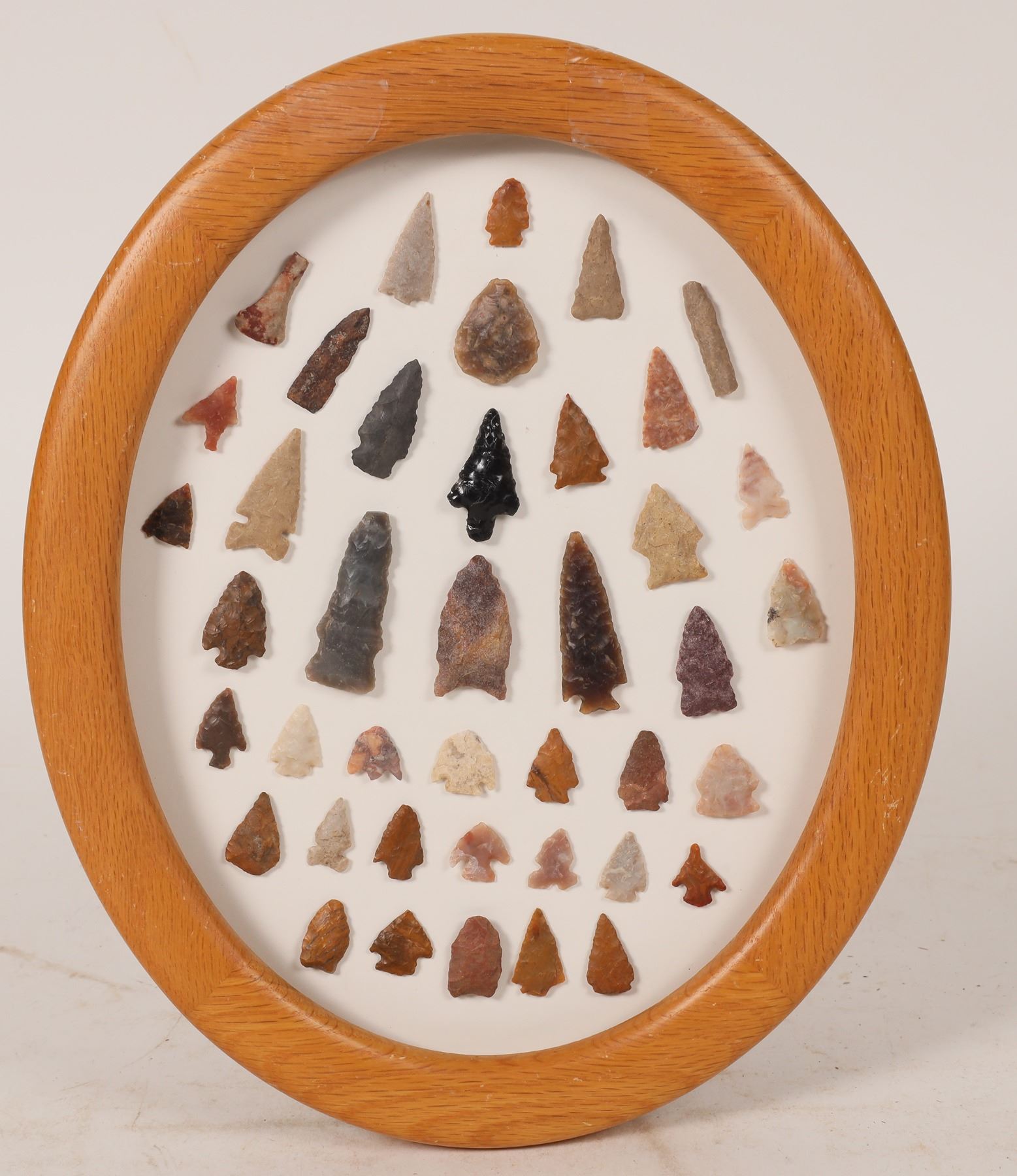 This oak framed set of points have been collected from Colorado. There are about forty points from .5 in. to 2.0 in. in length. There are side notches, drills, tapers, corner notched, and concave. From a number of time periods. A great way to depict the chronology of the state. Please see photo for details. Colorado