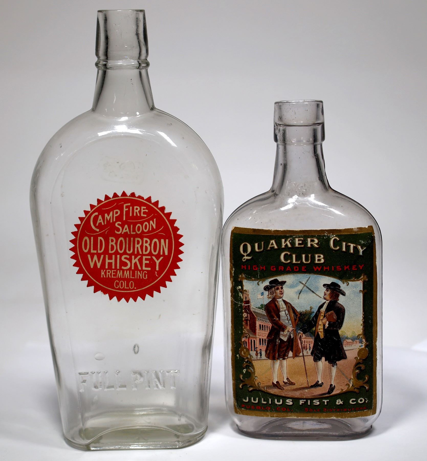 Lot of 2 different. 1) Camp Fire Saloon Old Bourbon Whiskey, Kremmling, Colo. Pint shoo fly, clear, 8.75". Bottle has damage to neck. Label is in good condition. 2) Quaker City Club High Grade Whiskey, Julius Fist & Co., Pueblo. Colorful label with vignette of Quakers. Bottle is 6.75" pocket flask. Some wear to label. Please inspect.