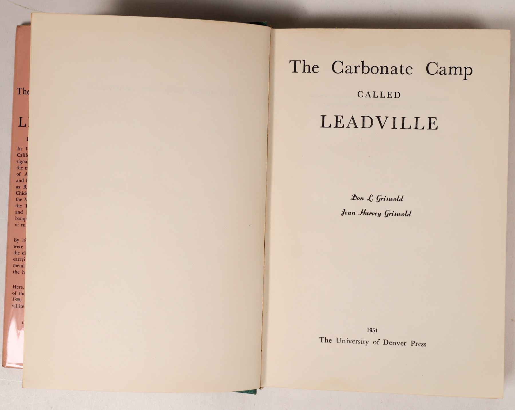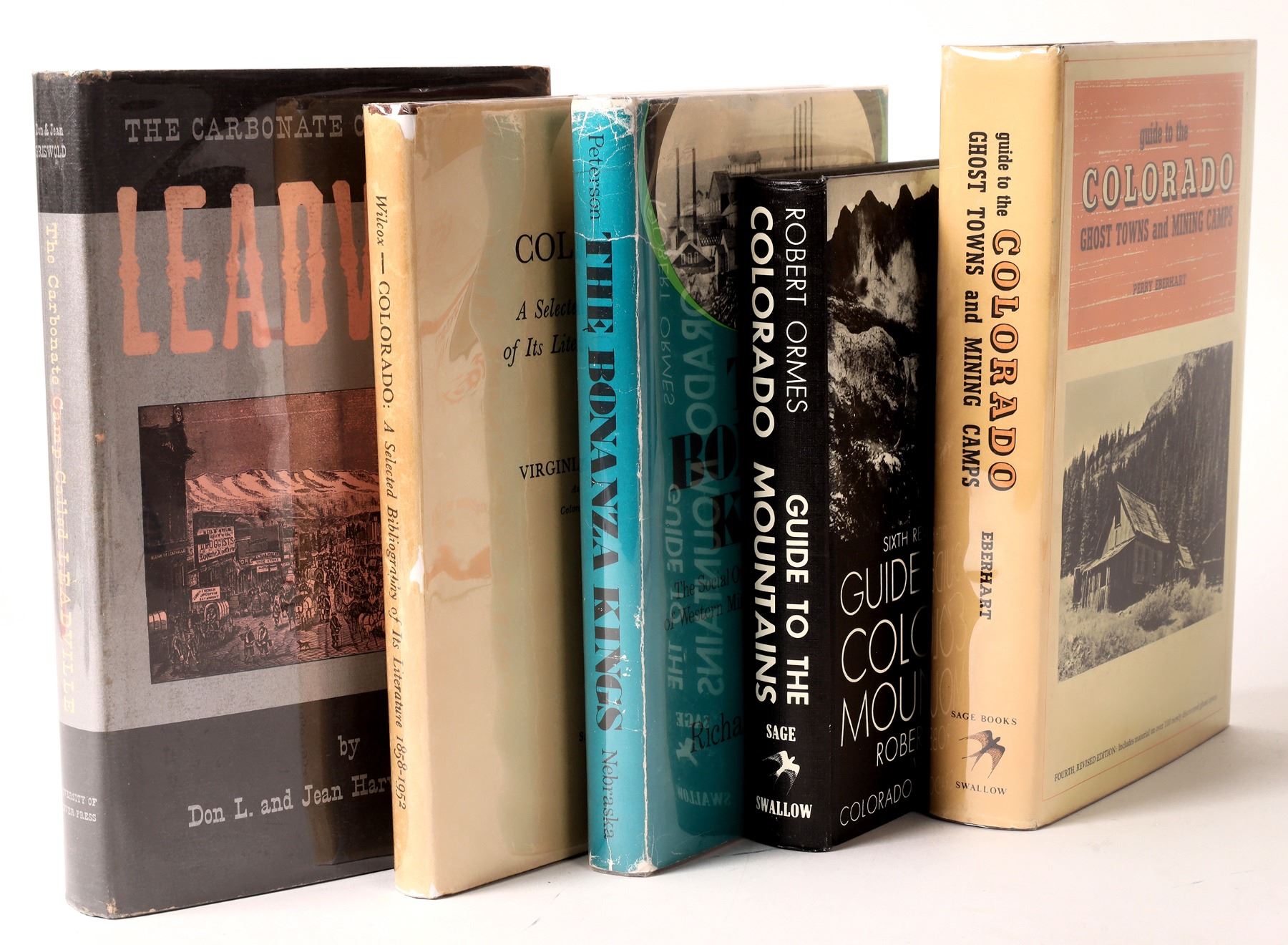 More Colorado Publications (5) #4. 1) "The Carbonate Camp Called Leadville", by Don L. & Jean H. Griswold, published by The University of Denver Press, 1951. Illustrated with photographs. (6" x 9" HB, 282 pages). 2) "The Bonanza Kings", The Social Origins and Business Behavior of Western Mining Entrepreneurs, 1870-1900, by Richard H. Peterson, published by University of Nebraska Press, Lincoln, 1971~ (5-1/2" x 8-1/2" HB, 191 pages). 3) "Colorado", A Selected Bibliography of its Literature, 1858-1952, by Virginia Lee Wilcox, published by Sage Books, Denver (5-1/2" x 8-1/2" HB, 155 pages). 4) Colorado Ghost Towns & Mining Camps Guide, by Perry Eberhart, 1959. 4th revised edition, publ. by Sage Books, 1968. (Profusely illustrated, 6" x 9" HB, 496 pages). 5) "Guide to the Colorado Mountains", by Robert Ormes, with The Colorado Mountain Club. 6th Ed., published by the Swallow Press, Chicago, 1971.