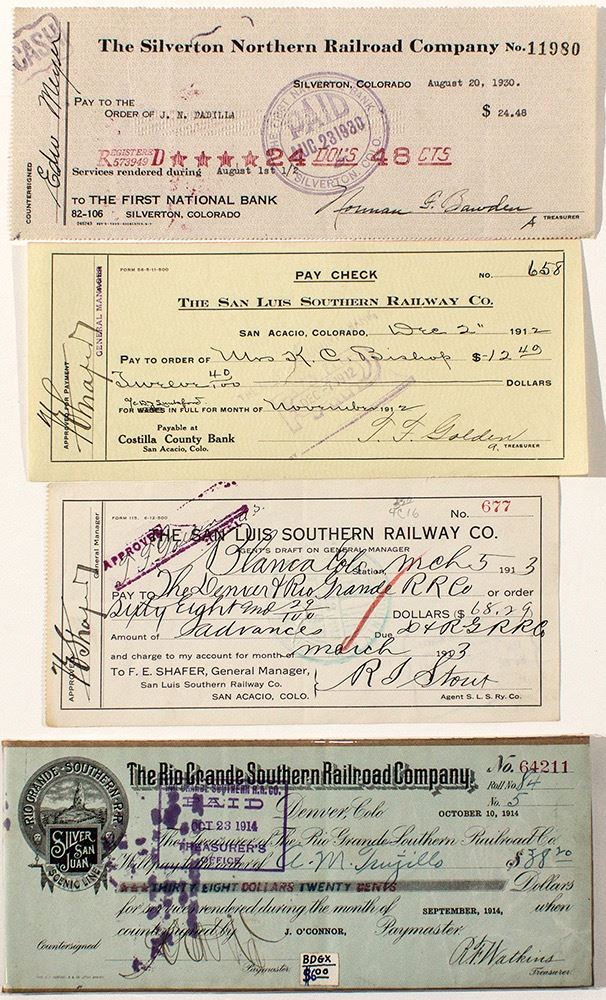 Lot of 4. 1) Rio Grande Southern Railroad Co., Silver San Juan Scenic Line, draft w/ vignette (1914). 2) A paycheck (1912) and draft (1913) for the San Luis Southern Railway Co. (Blanca Station and San Acacio). 3) Silverton Northern Railroad Co. draft (1930). (Prag Collection) City: State: Colorado Date: hwac# 24560