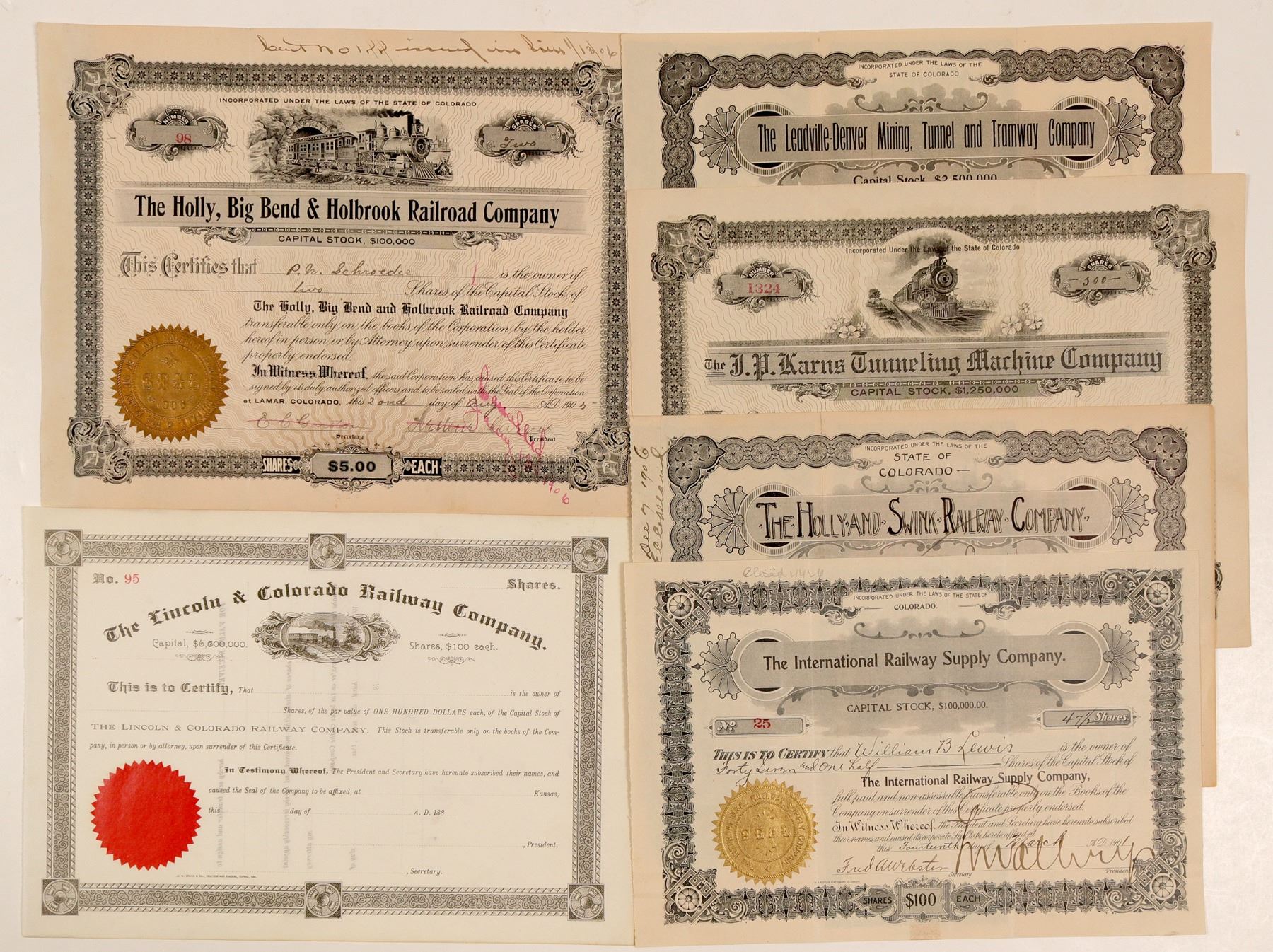 1. The Lincoln & Colorado Railway Co . part of Union Pacific RR consolidation 1888. U/U , #95, dated 188_, BLACK, rad seal, vignette of cab less loco l-r . W. Crane & Co printer. EF cond. 2. The Leadville-Denver Mining, tunnel and Tramway Co. Incorp State of Colorado, built 3,860 tunnel through the Mesquite range. #72, I/U, 596 shares @ $5 par. Issued Katherine Tucke May 3, 1904. signed Ja. A. Shimm President. BLACK, no vignette, embossed gold seal. The W. H. Kistler Stationery Co printer. F cond.