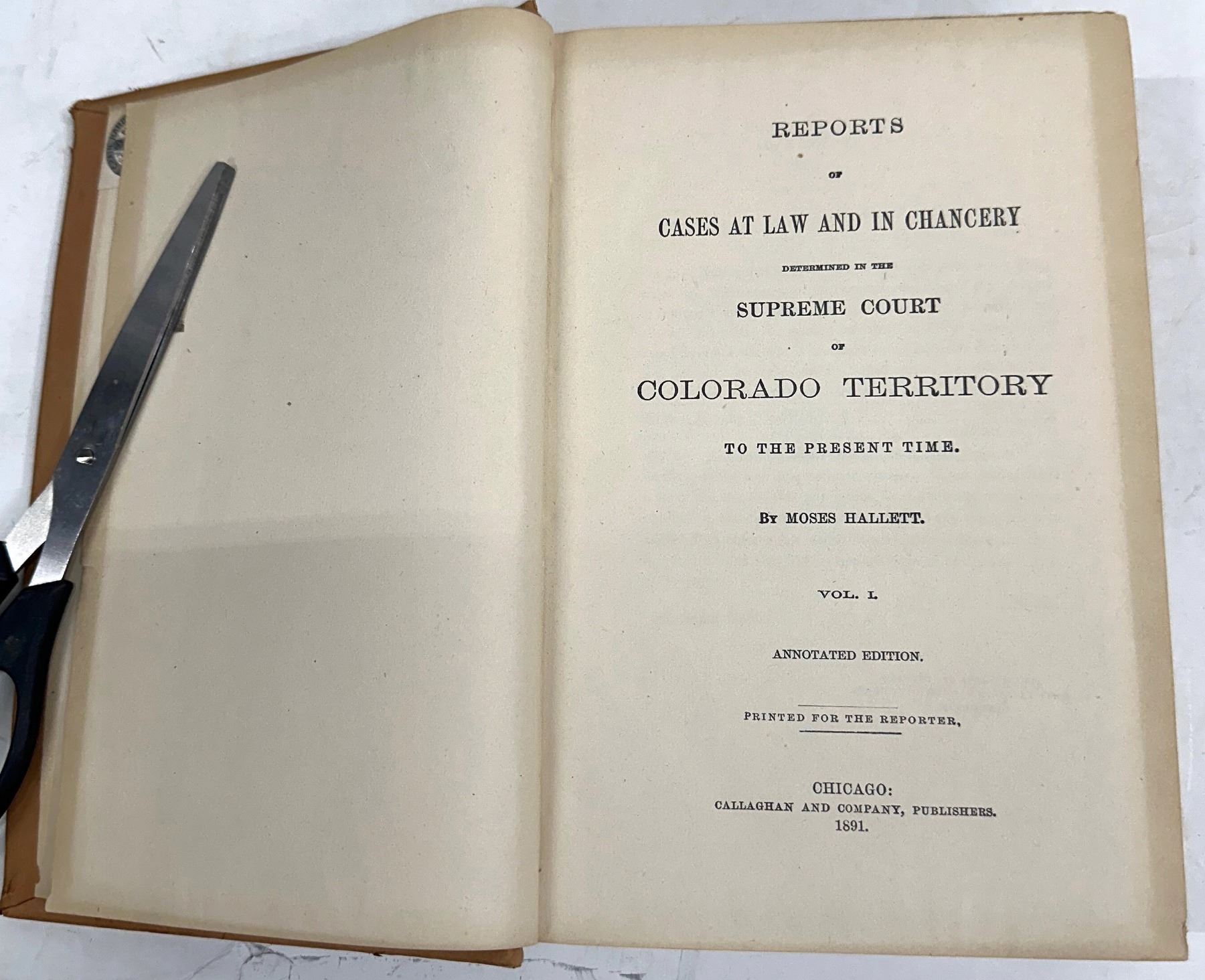 1891 Colorado Reports with spine stamp, "Madison County Montana Law Library" and W. A. Clark sticker below. William Andrews Clark Sr., an American entrepreneur, was involved with mining, banking, railroads and politics.