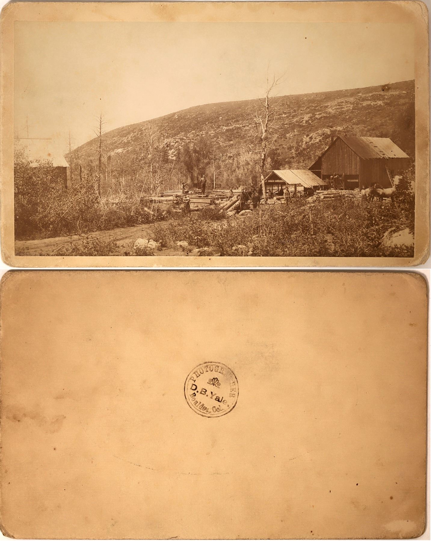 Cabinet card by DB Yale of Boulder, Colorado (stamped on reverse) showing a sawmill lumber operation in the foothills. A dozen or so people are visible, including women and children, and both logs and lumber. Location is likely a little north of Boulder (no Flatirons are visible). Some soiling. 5 x 8" According to Mautz, Yale was active in Boulder from 1888-1889.