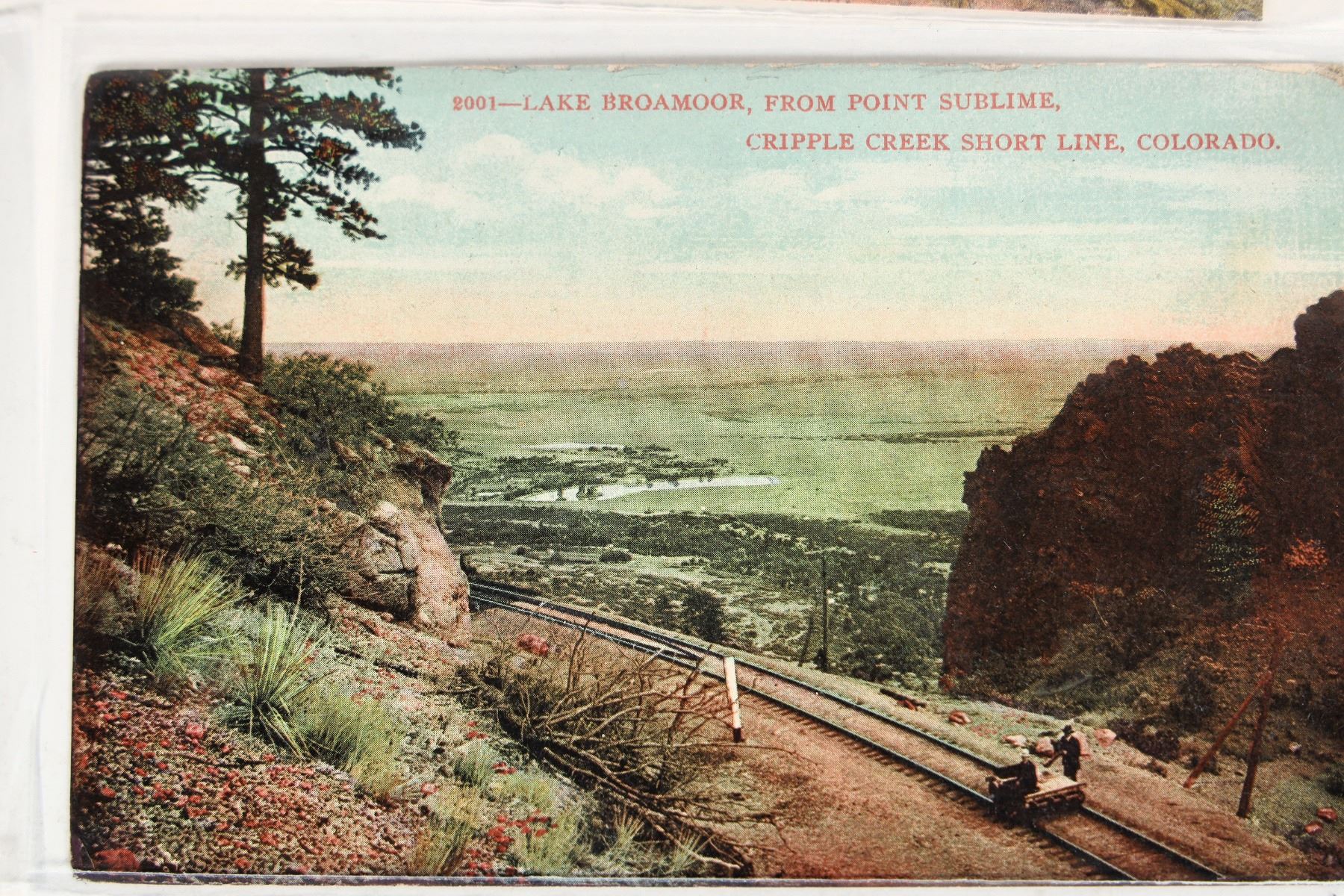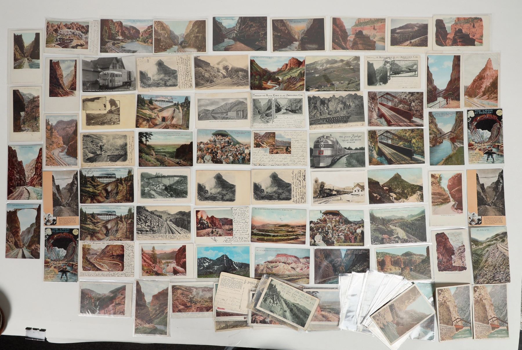 100 plus. 15 are RPC's. One PMC, one Souvenir post Card locomotive under full power, . One embossed color card of Georgetown Loop and Royal Gorge. One post mark Panama California Inter. Expo @ San Diego Ca. 1916.Some of the best Colorado landscapes scenes. One Dual locomotives pulling passenger cars over high steel bridge Georgetown loop. In good condition.