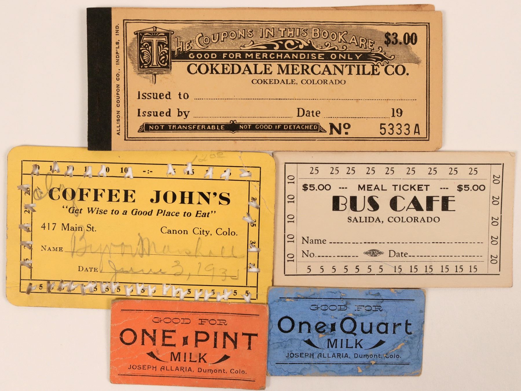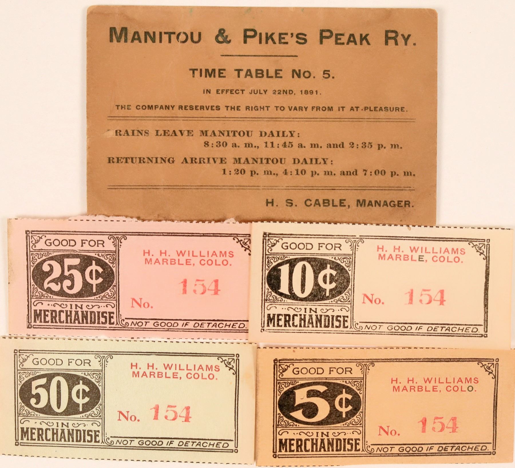 Ten pieces of small town good for scrip from: Salida, Dumont, Cokedale, Marble, Canon City and Manitou. Ex: Ron Lerch Collection.