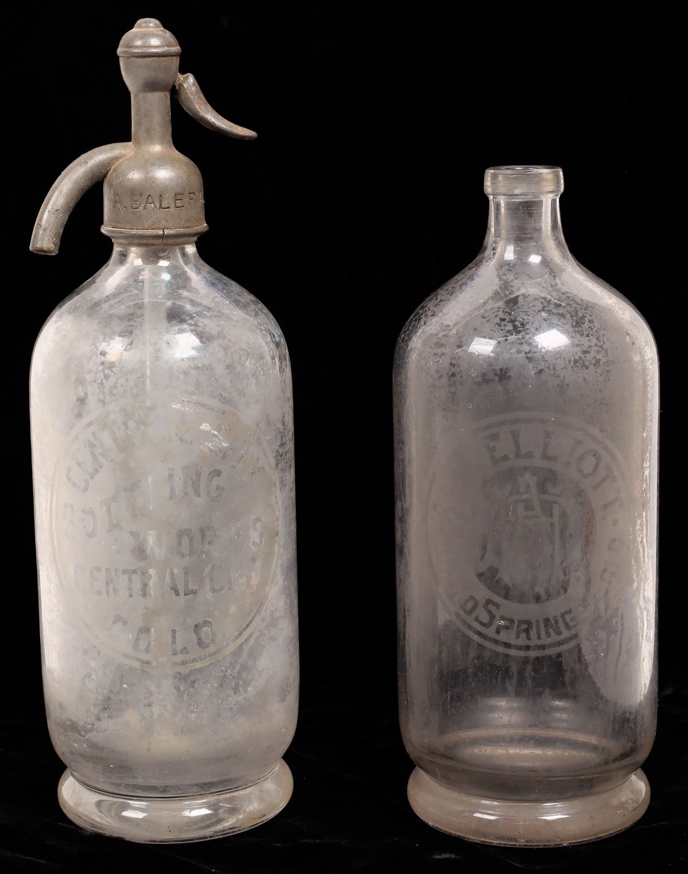 2 clear Colorado seltzer bottles. H A Elliot, Colorado Springs, no siphon, 539 in Preble. Unlisted Central City bottling. No apparent chips or cracks. Colorado