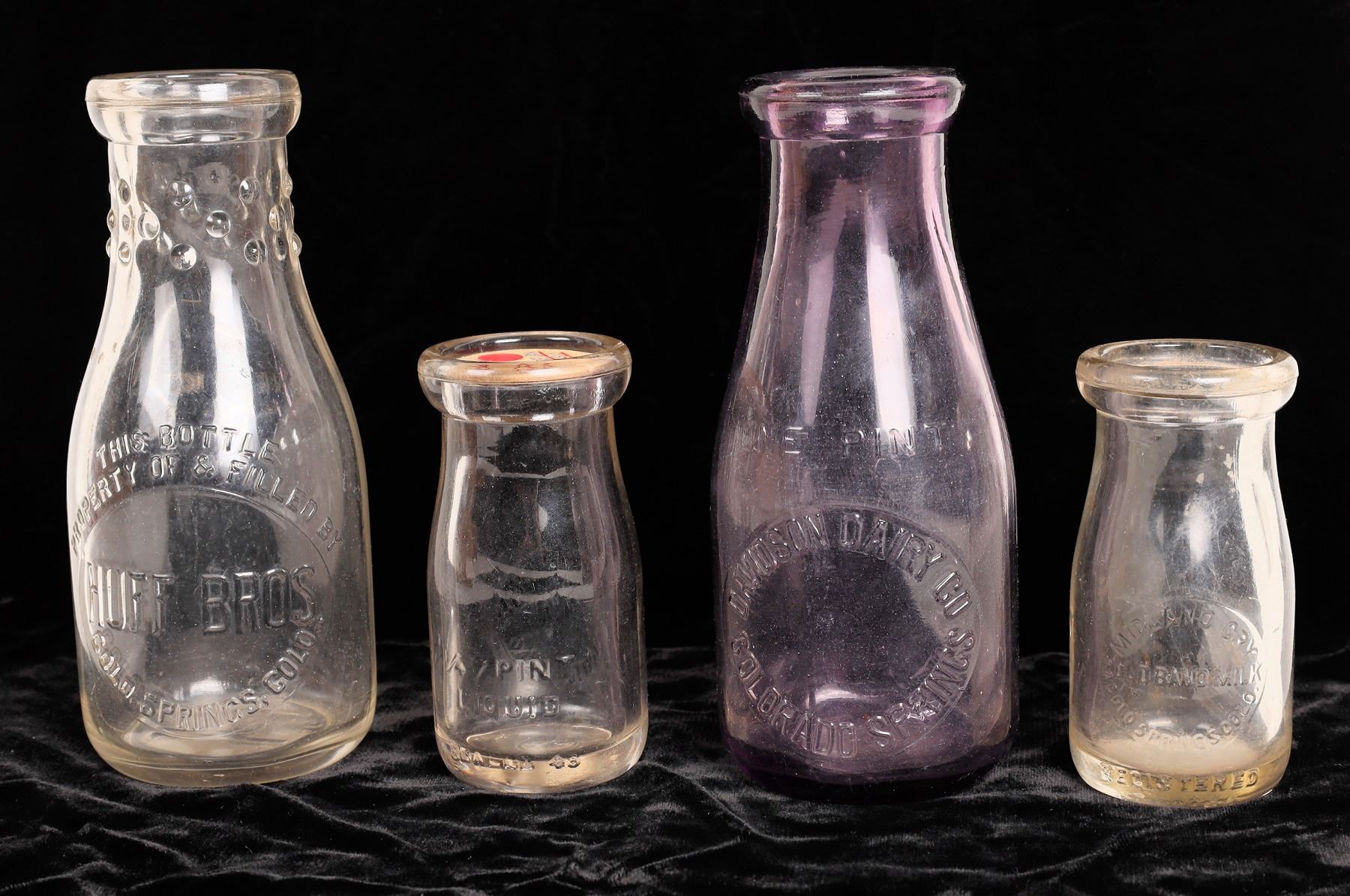4 Colorado milk bottles. Half pint-Midland Cry./Gold Brand Milk/Colo. Springs Colo.-partial ground base. Francisco's Dairy, Manitou. Pint-Davidson Diary Co./Colorado Springs. Huff Bros./Colo. Springs. Colo. Colorado Springs & Manitou Colorado