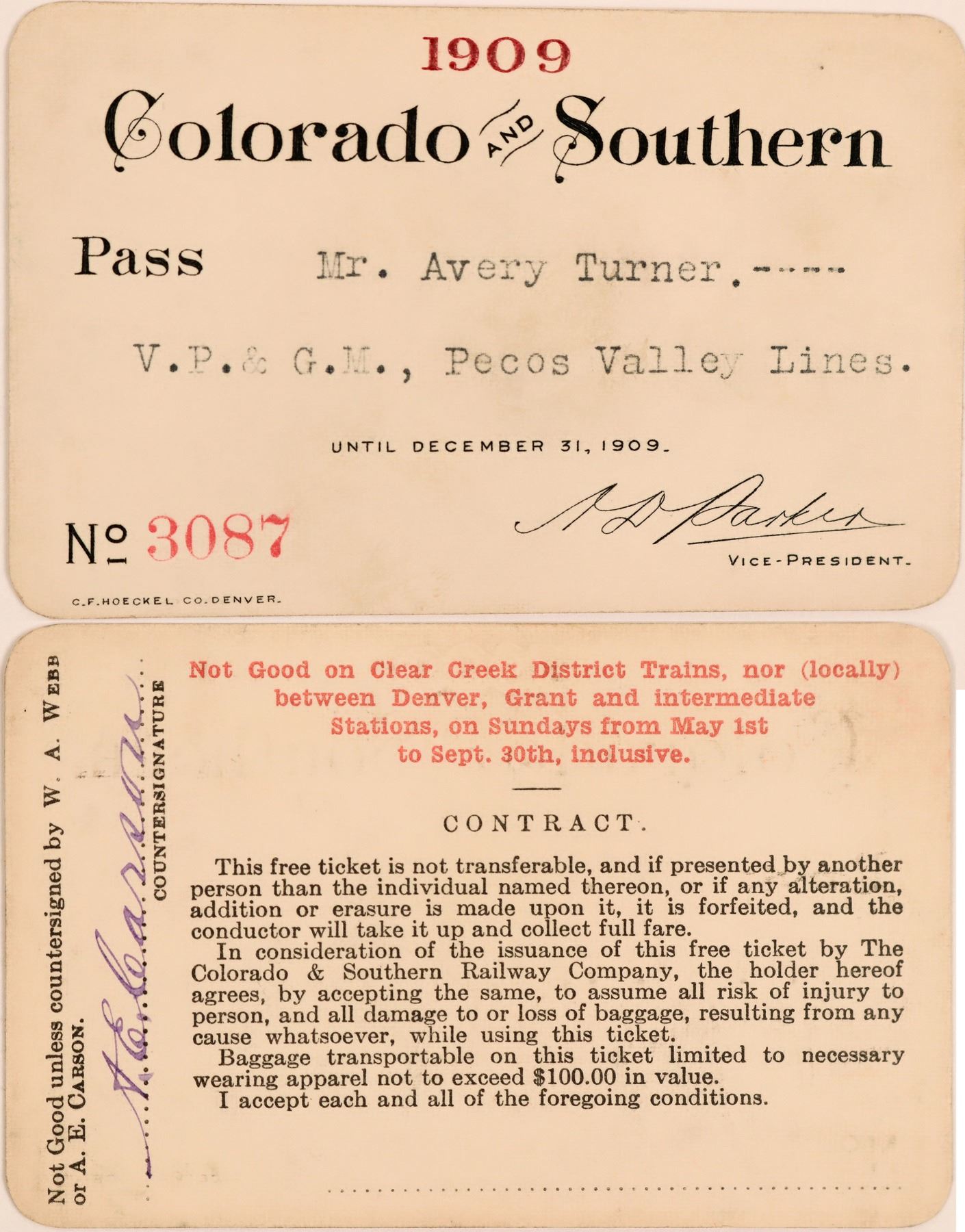 No. 3087, issued to Mr. Avery Turner, VP & General Manager of the Pecos Valley Lines. Signed by vice-president ND Parker. Counter-signed by AE Carson on the reverse. Black and red print on tan cardstock. Some soiling. Formed in 1898 as the merger of several Colorado railroads, it operated independently until 1908 when it became part of the CB&Q.