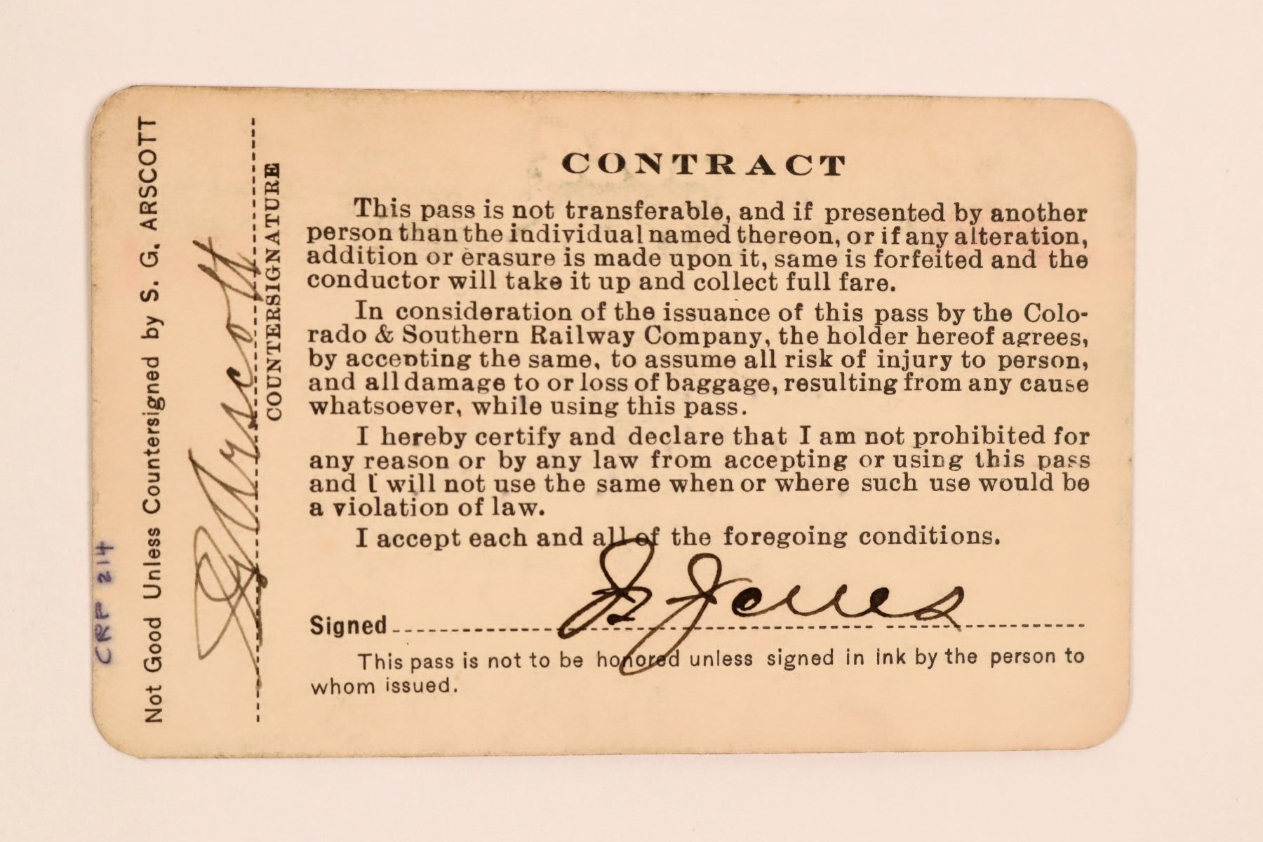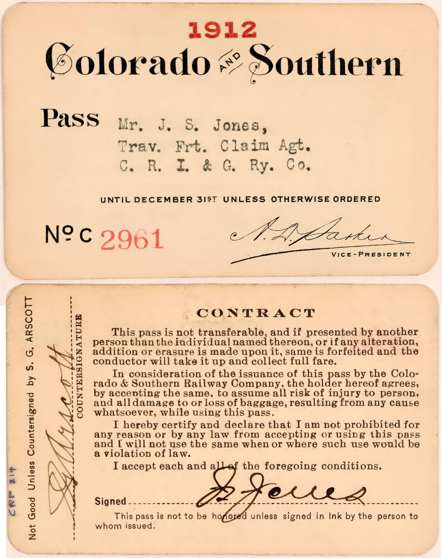 No. 2961, issued to Mr. JS Jones, travel freight claim agent for CRI&G Ry. Signed by vice-president ND Parker. Counter-signed by SG Arscott and endorsed by Jones on the reverse. Black and red print on tan cardstock. Some soiling. Formed in 1898 as the merger of several Colorado railroads, it operated independently until 1908 when it became part of the CB&Q.