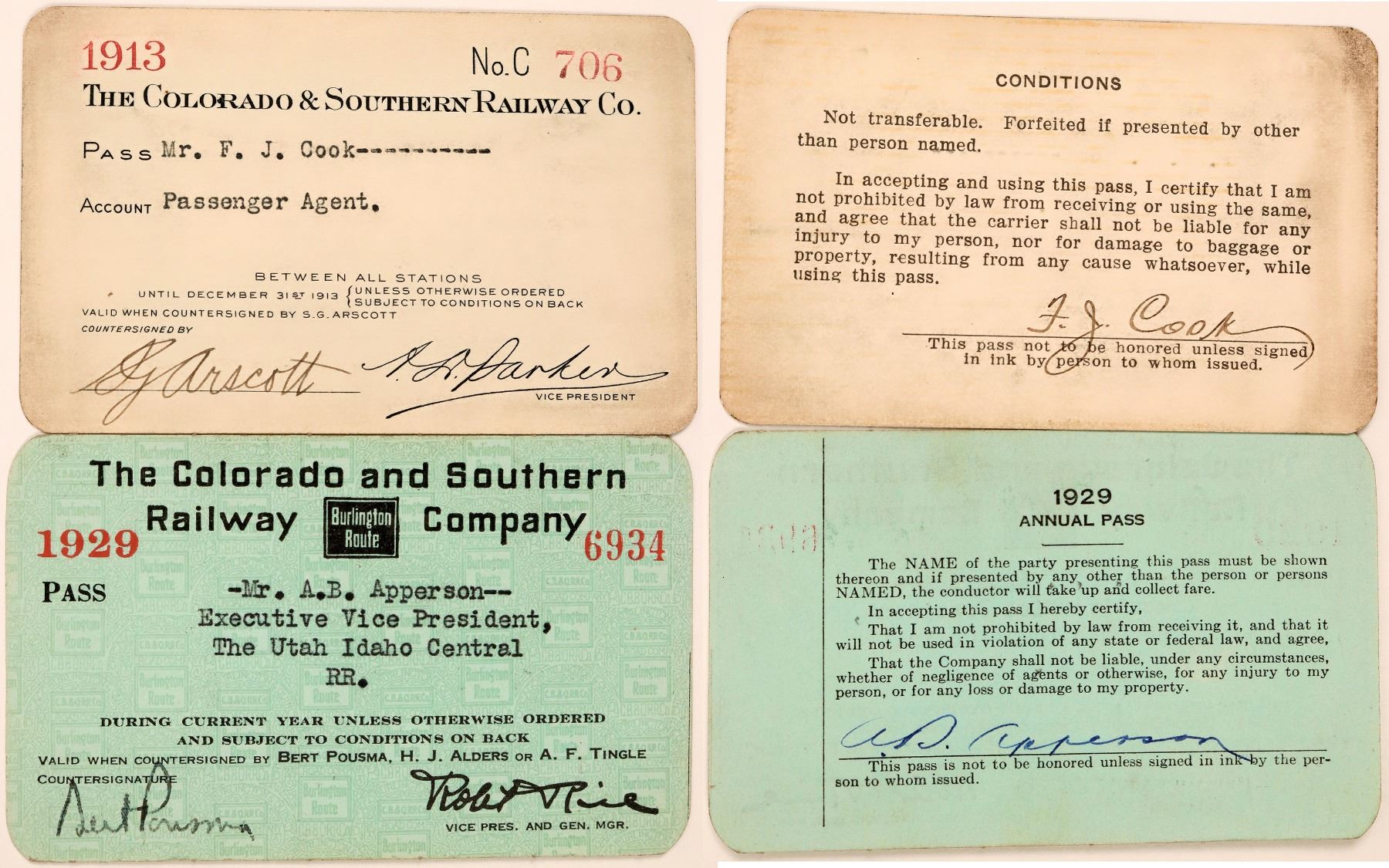 Lot of 2 different. 1) 1913 pass issued to FJ Cook, passenger agent. Black and red print on tan cardstock. Soiling. 2) 1929 pass issued to AB Apperson, executive vice president of the Utah Idaho Central Railroad. Minor wear.