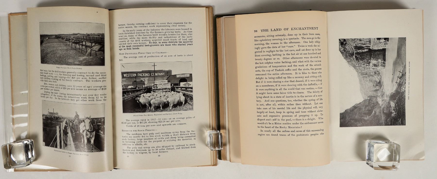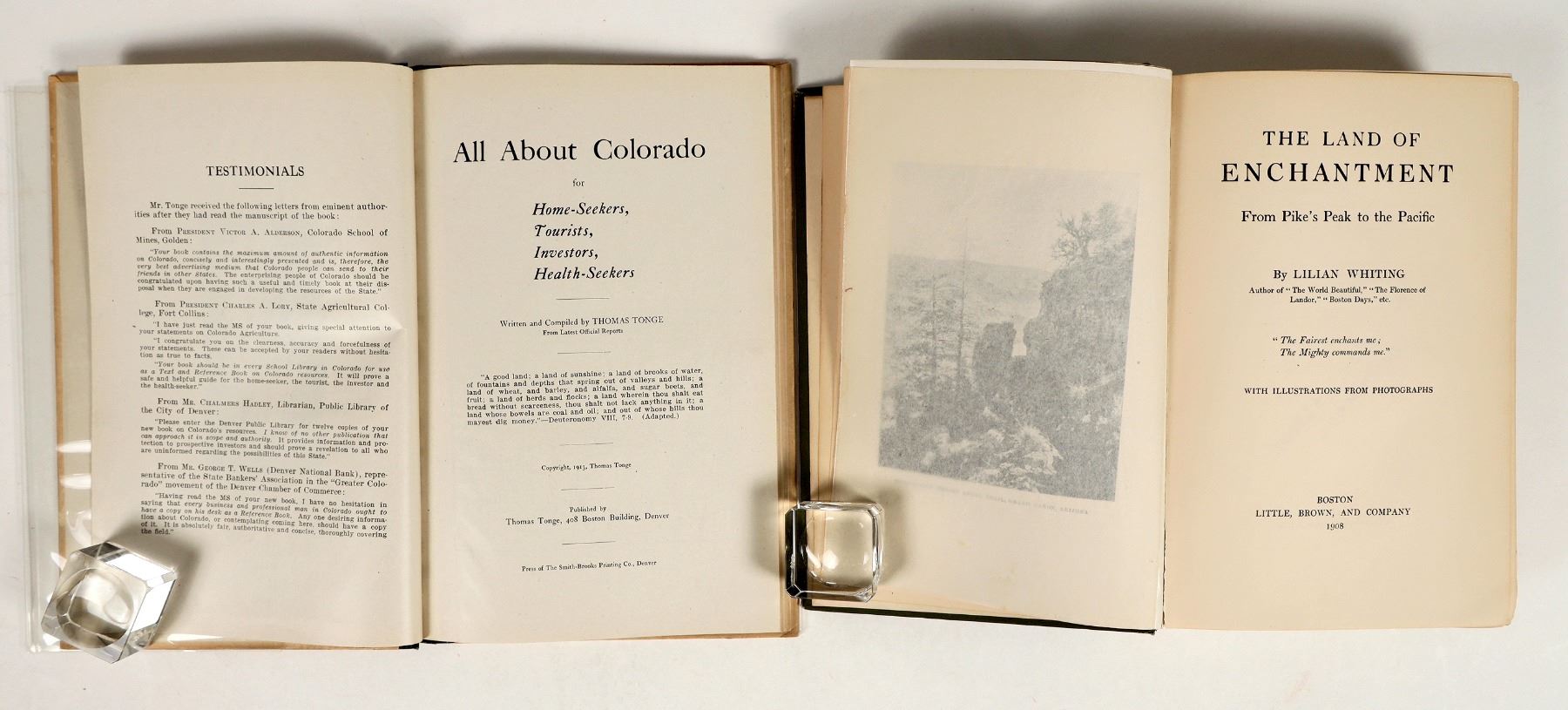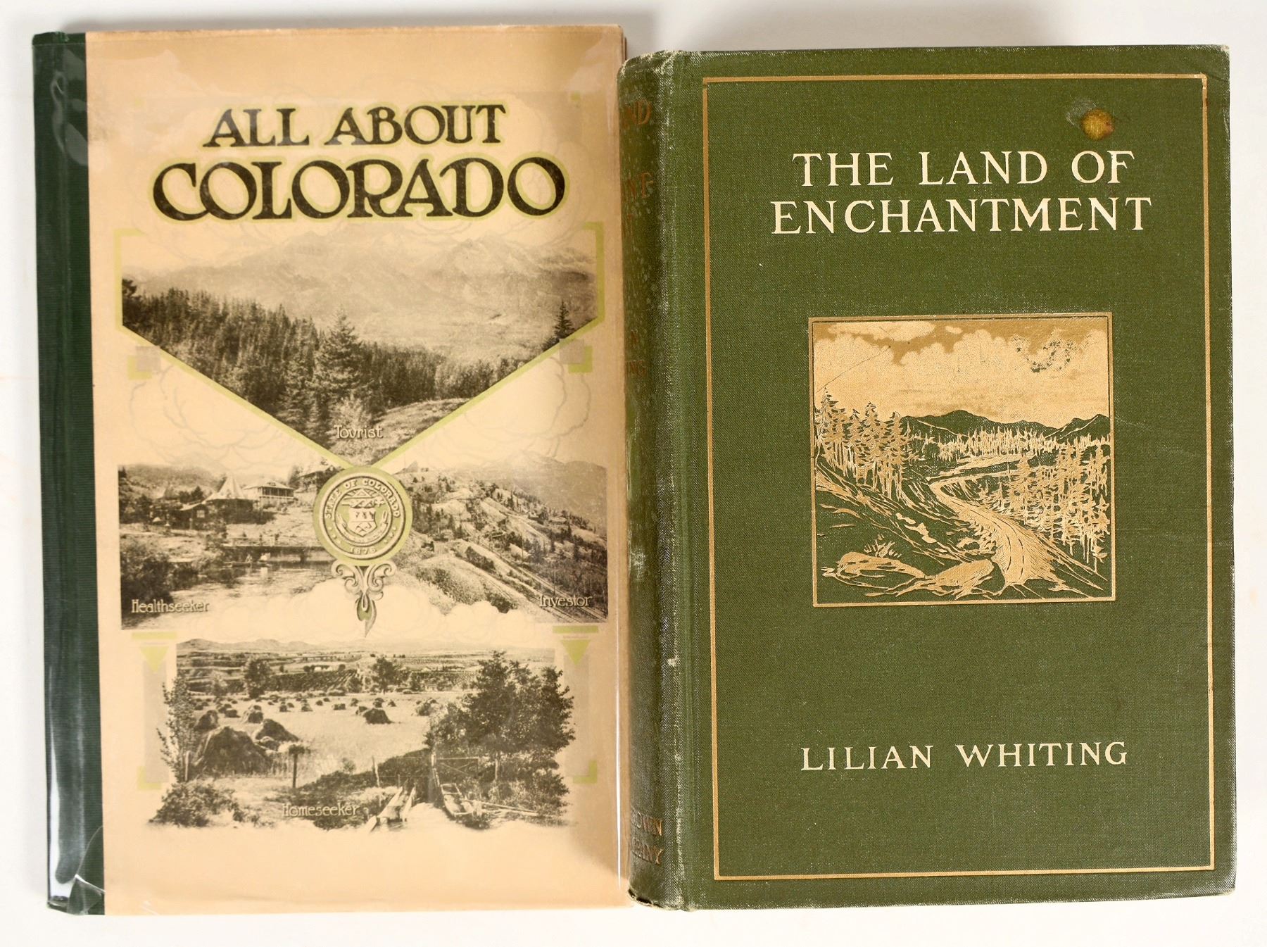 Group of 2 books on the American Southwest: 'The Land of Enchantment' by Lilian Whiting (1908) and 'All About Colorado' by Thomas Tonge (1913). Both are illustrated throughout with photograph. Both are in good condition with some minor cosmetic wear or toning; see photos.