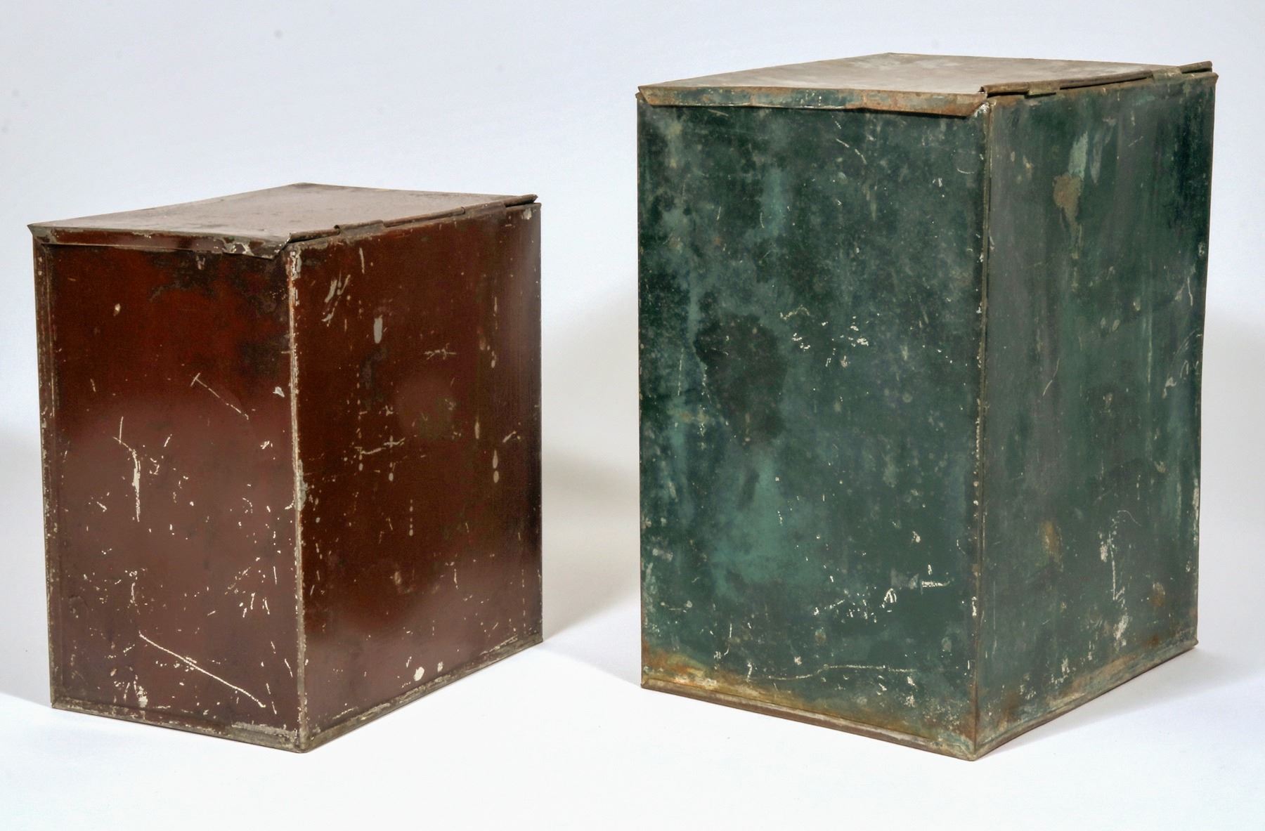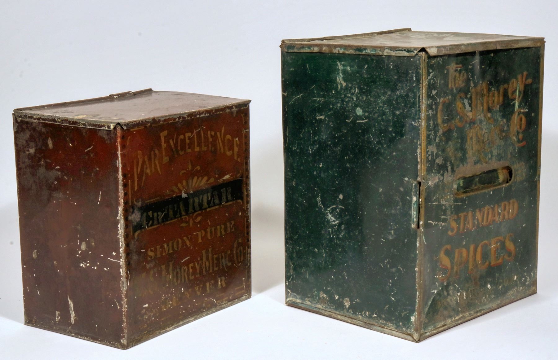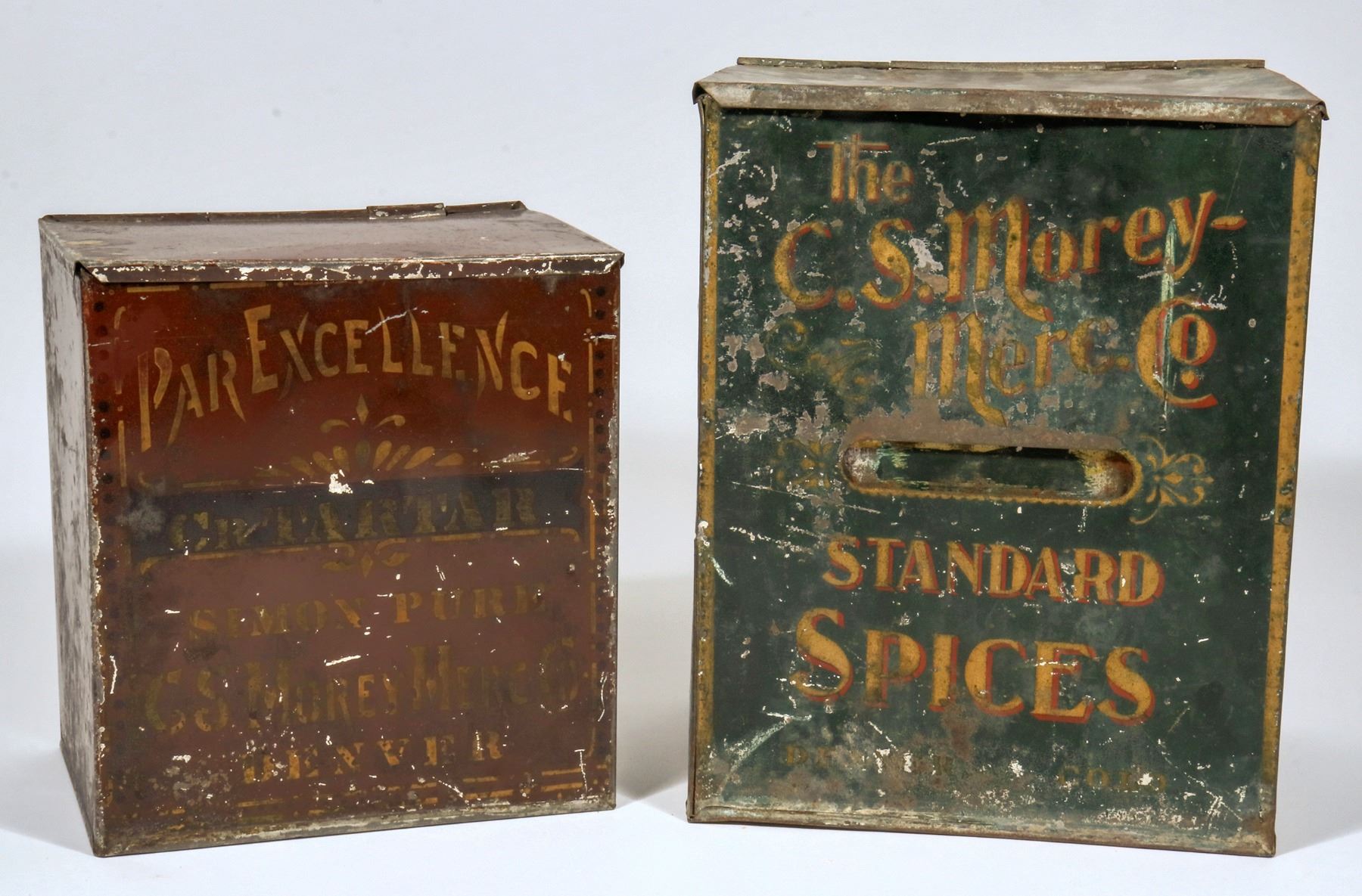 2 c. 1870's-80's Denver, Colorado spice tins with lids from CS Morey Merc. Brown Cr. Tartar, 7.5", some paint loss, no dents. Green standard spices, 9.75", small front dent, paint loss, mostly on lid. Denver Colorado Gary Bracken Collection