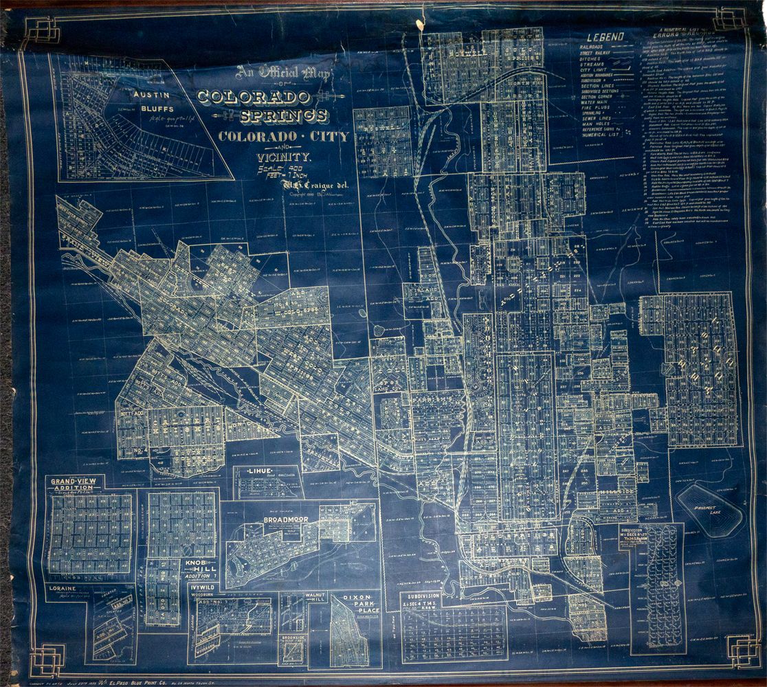 Very large linen backed blueprint map of the cities by W.H. Craigue. 1 mile = 6.75". Shows various developments, including the Broadmoor at lower center. Choice map made at the height of the first part of the Cripple Creek boom. Copyright J.A. Voorhees.