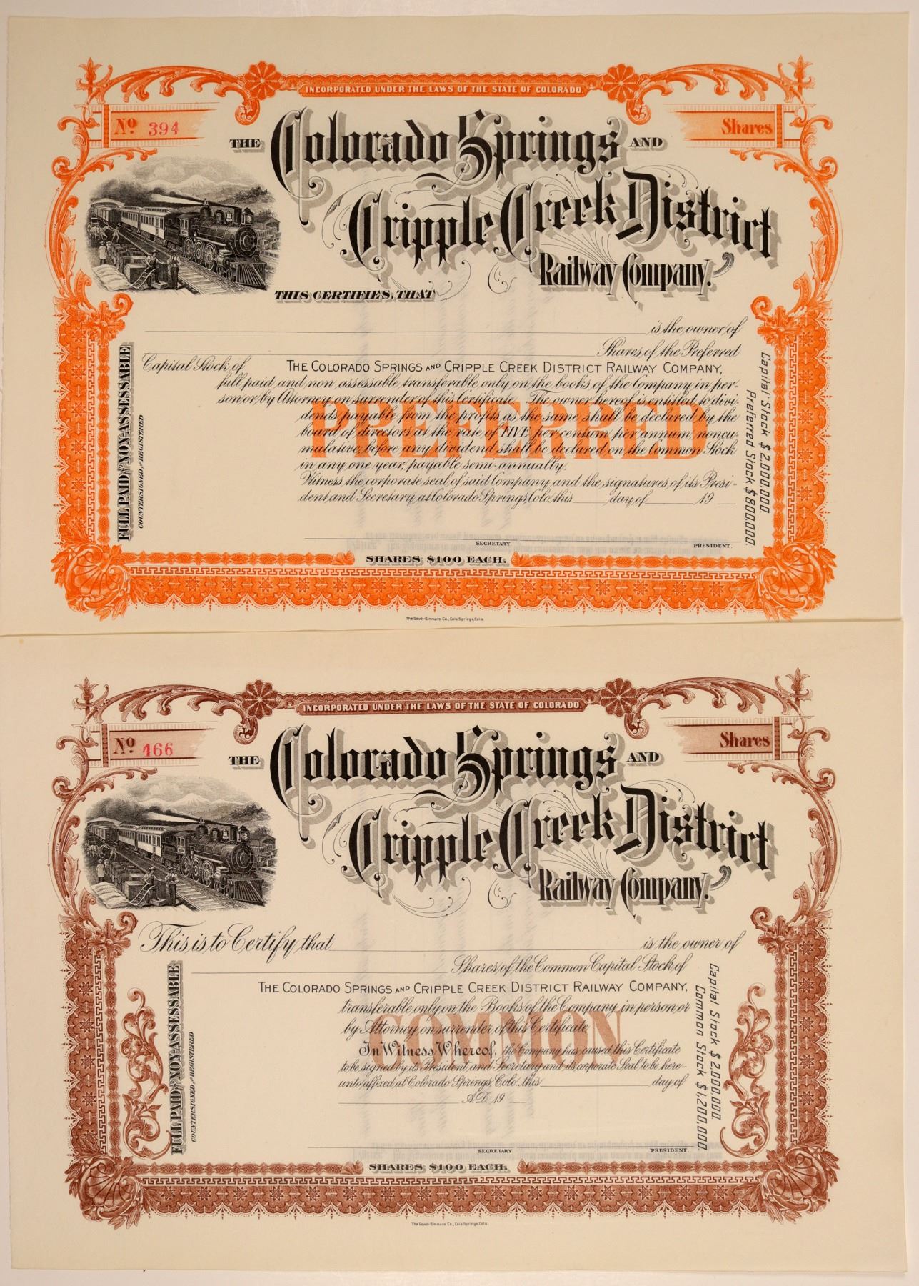 Lot of two different, both unissued. Post-1900. Brown or orange borders, locomotive vignette. Printed by The Gowdy-Simmons Co., Colorado Springs. 8.5 x 11.75" Clean. Known as the "Short Line." Eventually fell under the control of the Colorado & Southern Railway. City: Cripple Creek State: Colorado Date: