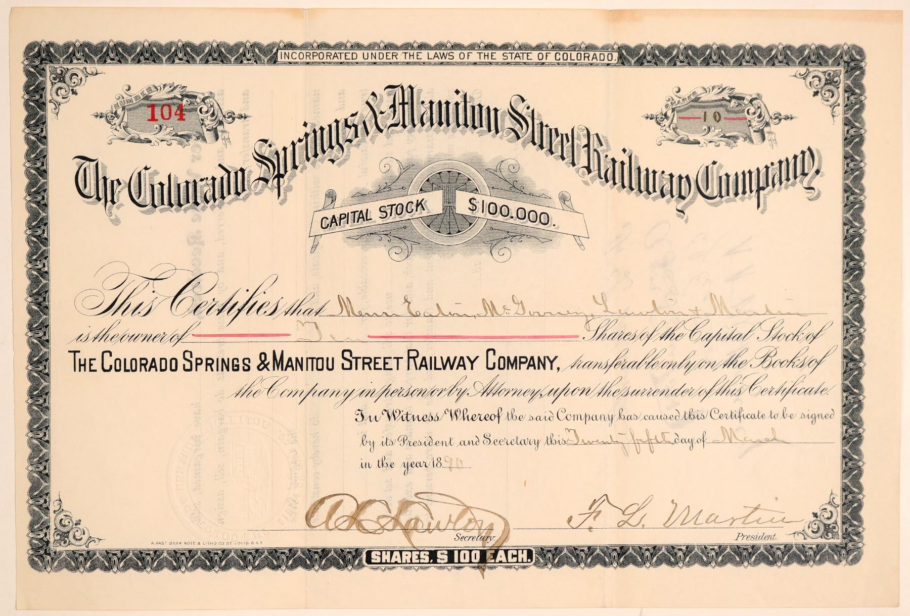 Stock Certificate from the Colorado Springs & Manitou Street Railway Co. Certificate number 104 issued in 1896 to Eaton, McGarvey, Lawbin and Martin Co. Signed by F.L. Martin (from the company?), and A. L. Lawlor(?). Size 11 by 7.5 inches. Light discoloration top. Nice condition. Not cancelled. Masthead w/wheel. Started in 1887, the first horsecar streetcar line in Colorado Springs. Ran from Colorado College to the Central Business District.
