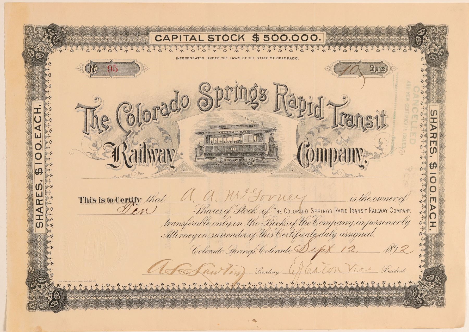 Stock Certificate from the Colorado Springs Rapid Transit Railway Co. Certificate number 95 issued in 1892 at Colorado Springs to A.A. McGovevhy(?). Signed by E.J. Eaton, Vice President, and A.S. Lawton(?). Size 11.5 by 8 inches. In average condition. Cancelled. Trolley car vignette. The Colorado Springs Rapid Transit Railway was chartered in 1890. They bought the system created by the Colorado Springs and Manitou Street Railway who had began horsecar trolley service in 1887. The Colorado Springs Rapid Transit Railway established the first electric trolley line to Manitou Springs in October 1890, as they transitioned from horse-drawn to electric trolleys. In 1901, Cripple Creek millionaire W.S. Stratton bought the line and combined it with the Colorado Springs & Suburban Railway Company to form the Colorado Springs and Interurban Railway. [Ref: www.trainweb.org]