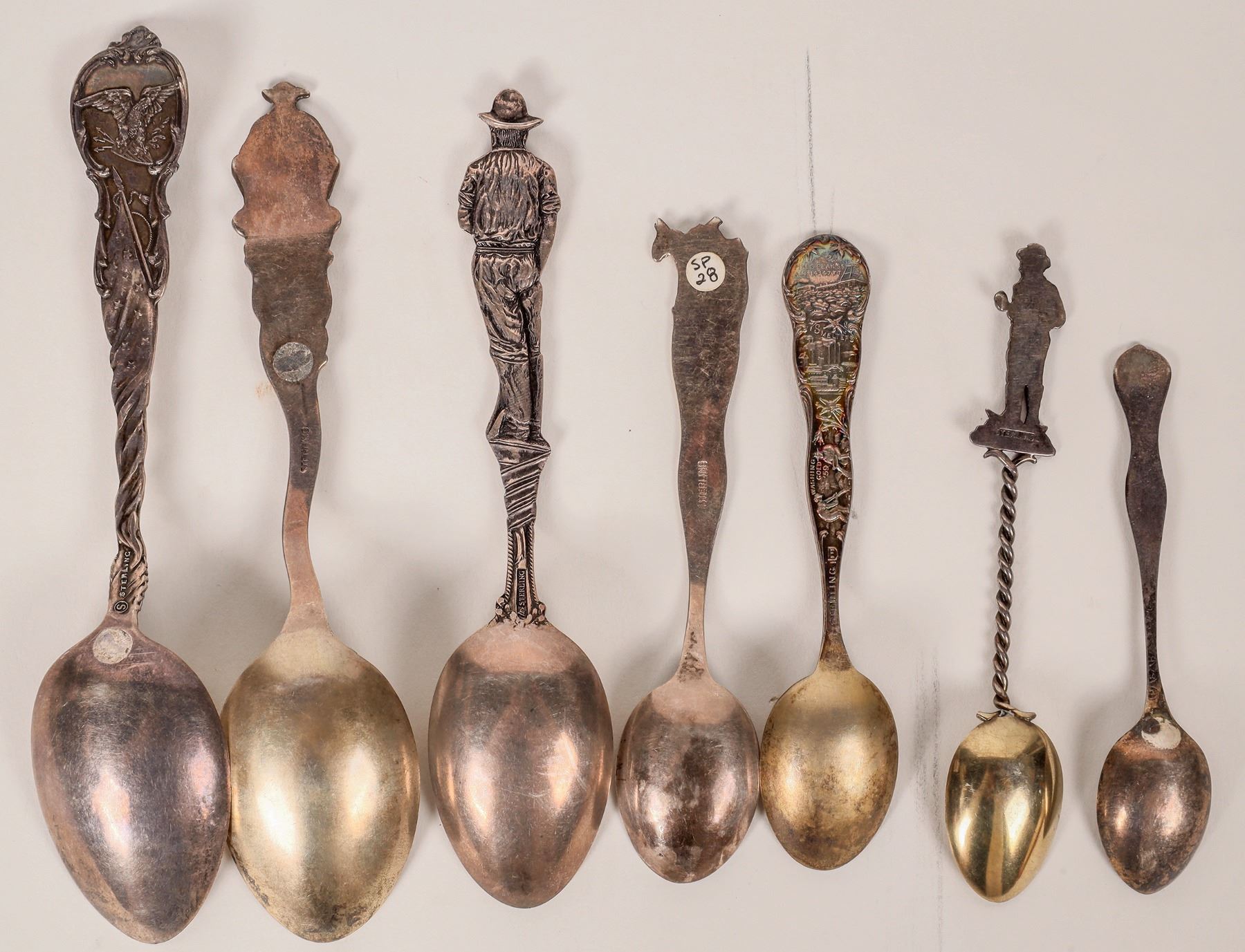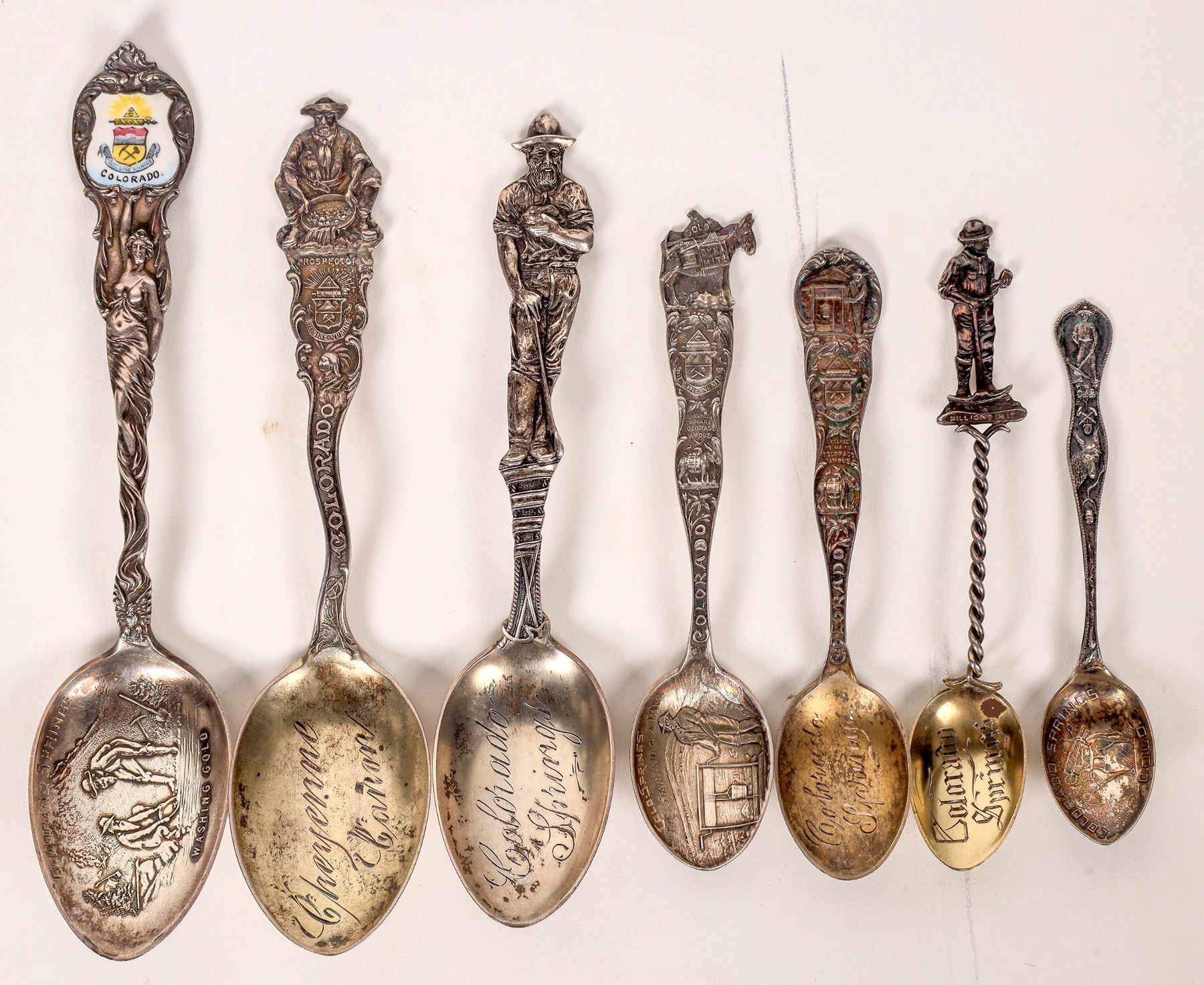 Lot of seven silver spoons. 1) Bowl is of miners washing gold. 2) Bowl is goldish and says Colorado Springs. 3) Miner bringing up gold. 4-5) One regular size and one petite Colorado Springs. 6) Colorado Springs burro. 7) Cheyenne, Wyoming Very nice set! Colorado Springs Colorado United States of America Franklin Collection