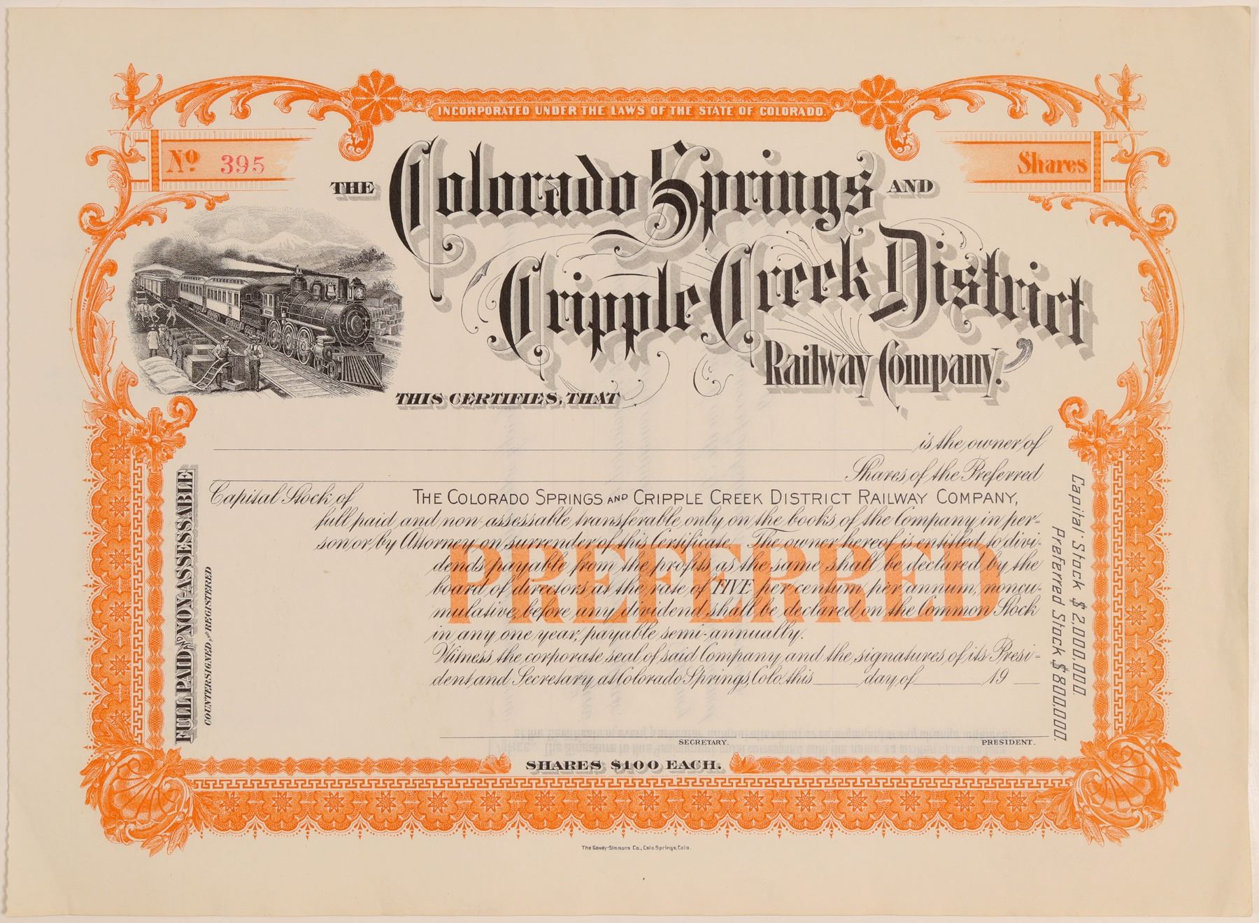 Stock Certificate from the Colorado Springs and Cripple Creek District Railway Co. Incorporated in Colorado. Certificate number 395 issued c1902 at Colorado Springs to. Size 11.5 by 8 inches. In nice condition. Unissued. PReferred stock. Colorful orange border and underprint. Train vignette. Standard gauge road. The Colorado Springs & Cripple Creek District Railway, constructed in 1900 as a 45.8-mile route, ran between Colorado Springs in El Paso County and the Cripple Creek-Victor Mining District in Teller County, Colorado. Converted during the early 1920s to an auto toll road known from 1924 through 1939 as the Corley Mountain Highway
