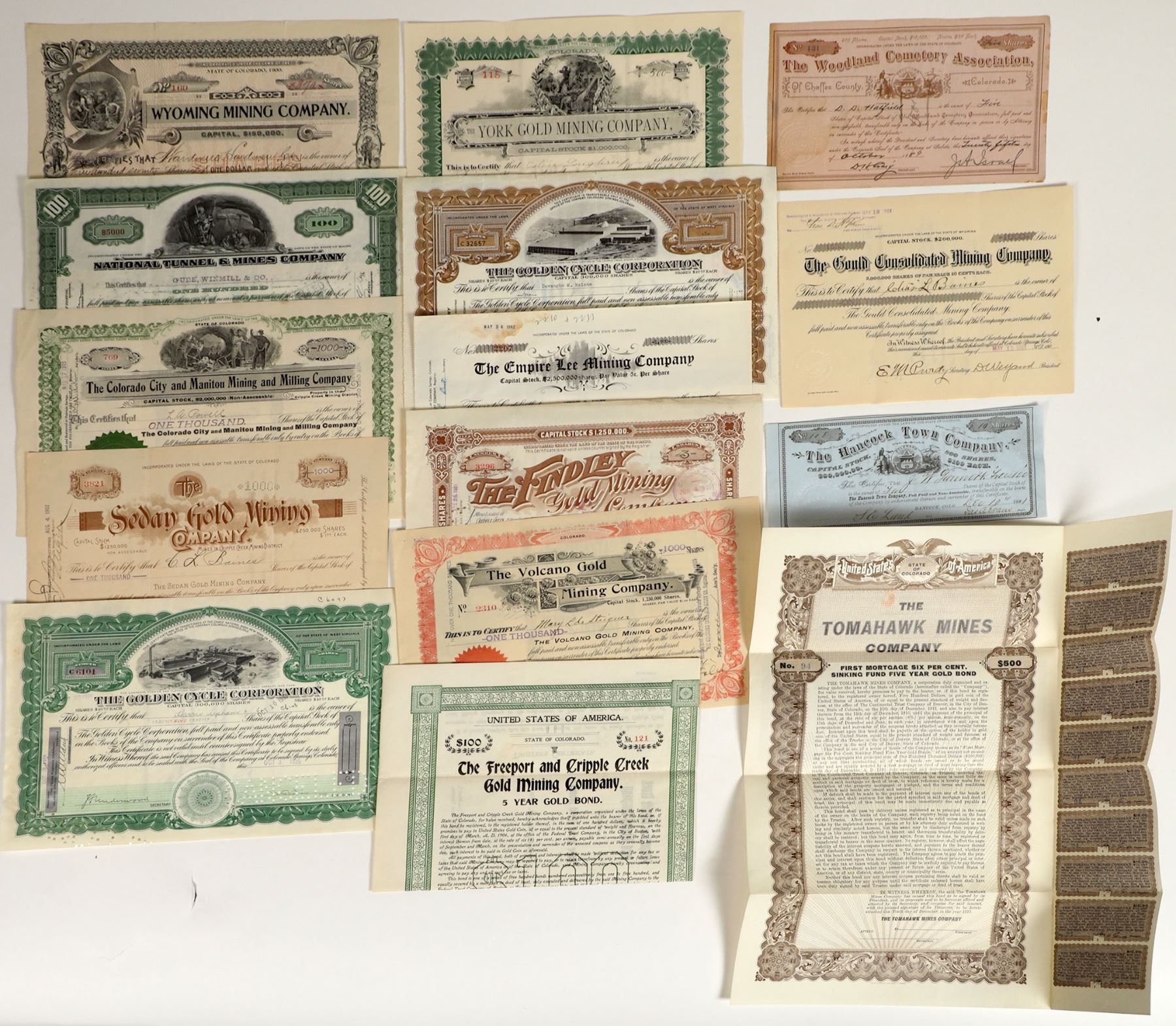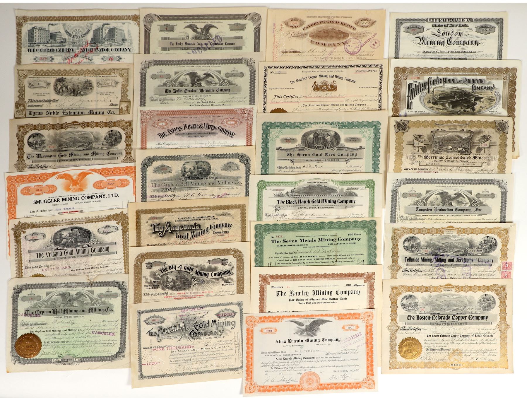 Lot of 40 different! Most are mining. Issued 1880s-1960s, with most clustered in the 1890s-1910s (a nice group of Cripple Creek mining stocks). Non-mining includes a cemetery stock, a townsite piece, power & water, etc. Please inspect. Instant collection!