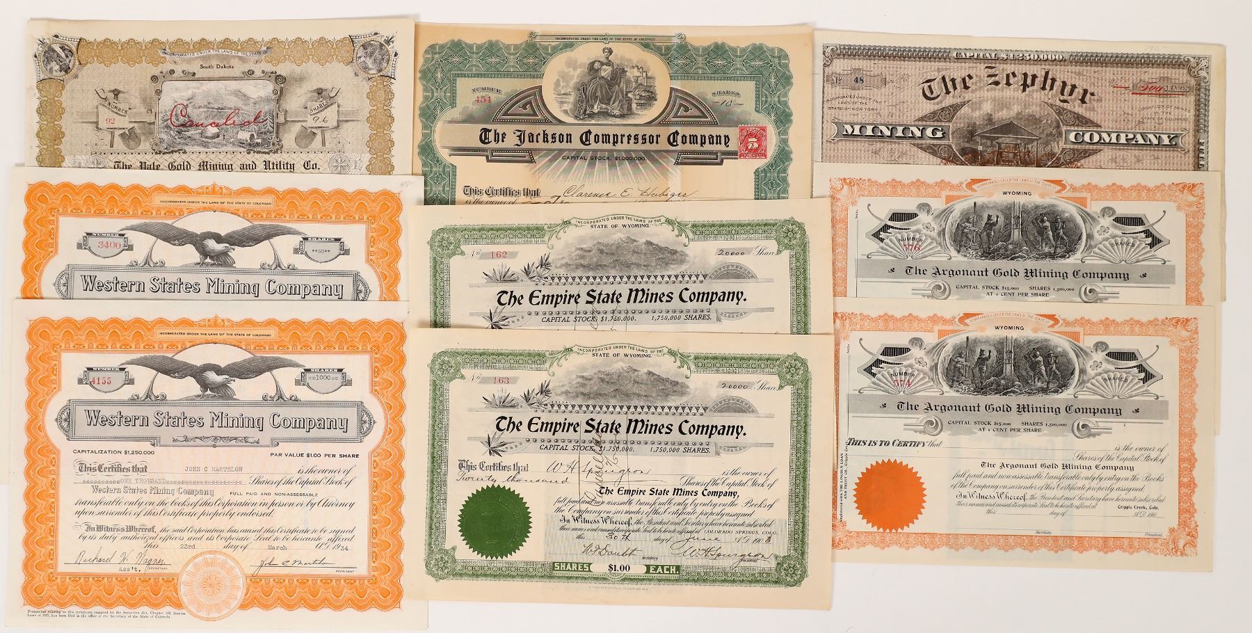 8 Colorado stocks. Yale Gold Mining, Zephyr Mining, 2x Argonaut Gold Mining, 2x Empire State Mines, Jackson Compressor, 2x Western States Mining. Colorado Colorado